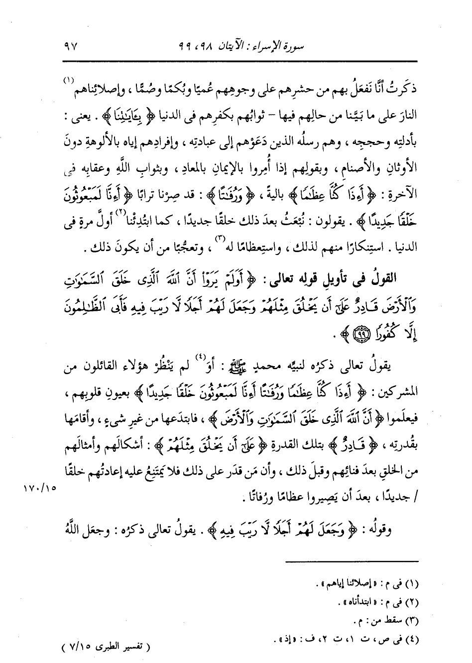 §الْقَوْلُ فِي تَأْوِيلِ قَوْلِهِ تَعَالَى: {أَوَلَمْ يَرَوْا أَنَّ اللَّهَ الَّذِي خَلَقَ السَّمَوَاتِ وَالْأَرْضَ قَادِرٌ عَلَى أَنْ يَخْلُقَ مِثْلَهُمْ وَجَعَلَ لَهُمْ أَجَلًا لَا رَيْبَ فِيهِ فَأَبَى الظَّالِمُونَ إِلَّا كُفُورًا} يَقُولُ تَعَالَى ذِكْرُهُ لِنَبِيِّهِ مُحَمَّدٍ صَلَّى اللهُ عَلَيْهِ وَسَلَّمَ: أَوْ لَمْ يَنْظُرْ هَؤُلَاءِ الْقَائِلُونَ مِنَ الْمُشْرِكِينَ {أَئِذَا كُنَّا عِظَامًا وَرُفَاتًا أَئِنَّا لَمَبْعُوثُونَ خَلْقًا جَدِيدًا} بِعُيونِ قُلُوبِهِمْ، فَيَعْلَمُونَ أَنَّ اللَّهَ الَّذِي خَلَقَ السَّمَوَاتِ وَالْأَرْضَ، فَابْتَدَعَهَا مِنْ غَيْرِ شَيْءٍ، وَأَقَامَهَا بِقُدْرَتِهِ، قَادِرٌ بِتِلْكَ الْقُدْرَةِ عَلَى أَنْ يَخْلُقَ مِثْلَهُمْ أَشْكَالَهُمْ وَأَمْثَالَهُمْ مِنَ الْخَلْقِ بَعْدَ فَنَائِهِمْ، وَقَبْلَ ذَلِكَ وَأَنَّ مَنْ قَدَرَ عَلَى ذَلِكَ فَلَا يَمْتَنِعُ عَلَيْهِ إِعَادَتُهُمْ خَلْقًا جَدِيدًا، بَعْدَ أَنْ يَصِيرُوا عِظَامًا وَرُفَاتًا
