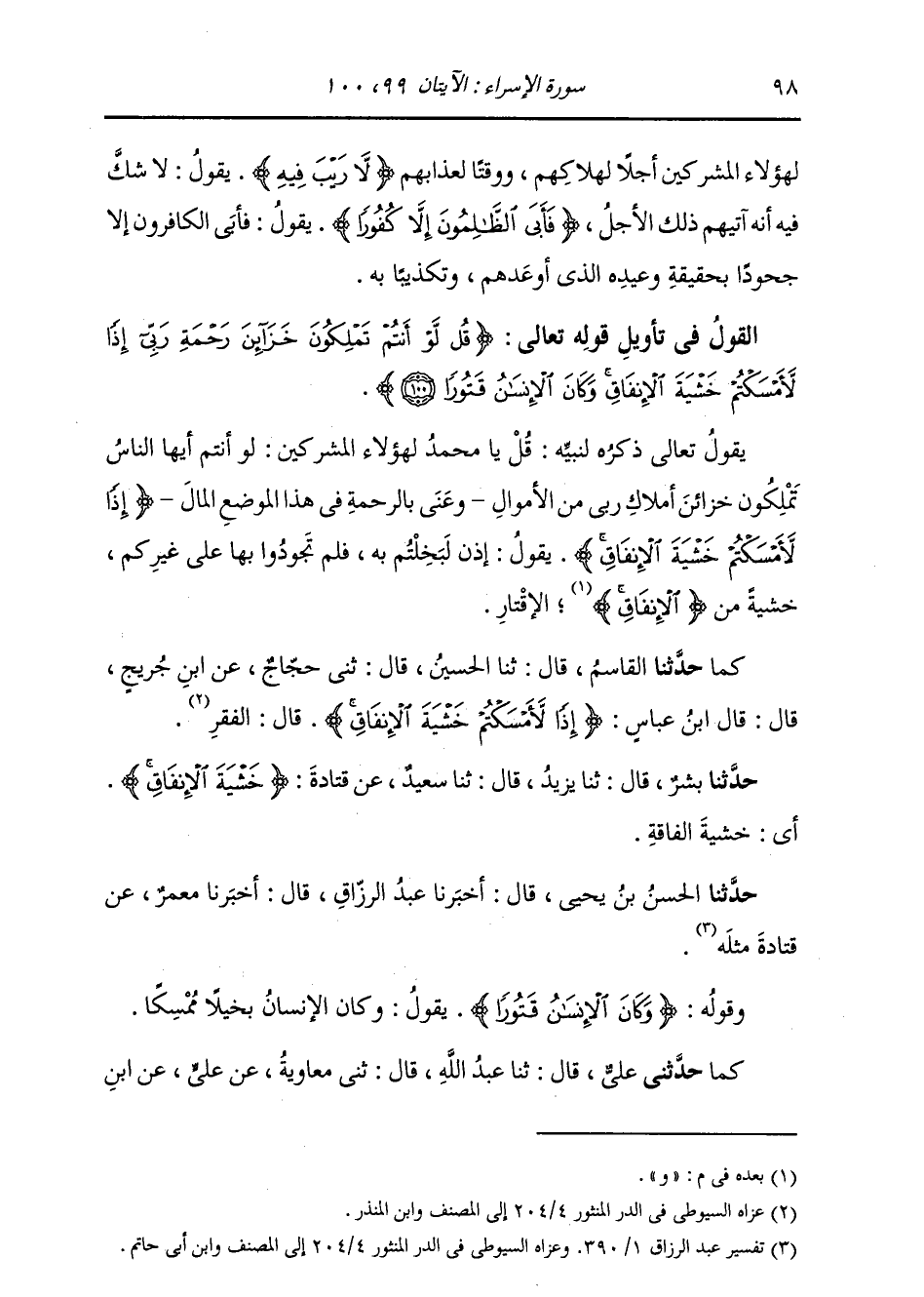 حَدَّثَنَا بِشْرٌ، قَالَ: ثنا يَزِيدُ، قَالَ: ثنا سَعِيدٌ، عَنْ قَتَادَةَ، {§خَشْيَةَ الْإِنْفَاقِ} [الإسراء: 100] أَيْ خَشْيَةَ الْفَاقَةِ حَدَّثَنَا الْحَسَنُ بْنُ يَحْيَى، قَالَ: أَخْبَرَنَا عَبْدُ الرَّزَّاقِ، قَالَ: أَخْبَرَنَا مَعْمَرٌ، عَنْ قَتَادَةَ، مِثْلَهُ