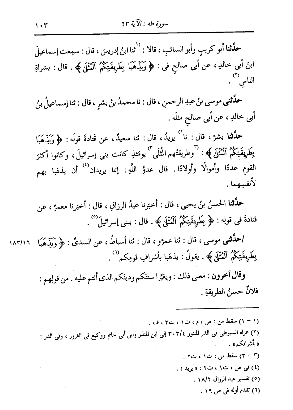 حَدَّثَنَا أَبُو كُرَيْبٍ، وَأَبُو السَّائِبِ، قَالَا: ثنا يَزِيدُ، قَالَ: ثنا سَعِيدٌ، عَنْ قَتَادَةَ، قَوْلُهُ: {§وَيَذْهَبَا بِطَرِيقَتِكُمُ الْمُثْلَى} [طه: 63] وَطَرِيقَتِهُمُ الْمُثْلَى يَوْمَئِذٍ كَانَتْ بَنُو إِسْرَائِيلَ، وَكَانُوا أَكْثَرَ الْقَوْمِ عَدَدًا وَأَمْوَالًا وَأَوْلَادًا. قَالَ عَدُوُّ اللَّهِ: إِنَّمَا يُرِيدَانِ أَنْ يَذْهَبَا بِهِمْ لِأَنْفُسِهِمَا