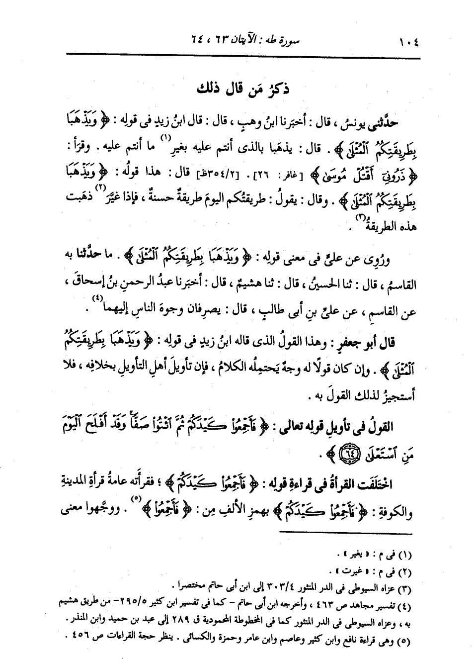 ذِكْرُ مَنْ قَالَ ذَلِكَ: حَدَّثَنِي يُونُسُ، قَالَ: أَخْبَرَنَا ابْنُ وَهْبٍ، قَالَ: قَالَ ابْنُ زَيْدٍ، فِي قَوْلِهِ: {§وَيَذْهَبَا بِطَرِيقَتِكُمُ الْمُثْلَى} [طه: 63] قَالَ: يَذْهَبَا بِالَّذِي أَنْتُمْ عَلَيْهِ، يُغَيِّرُ مَا أَنْتُمْ عَلَيْهِ. وَقَرَأَ: {ذَرُونِي أَقْتُلْ مُوسَى وَلْيَدْعُ رَبَّهُ إِنِّي أَخَافُ أَنْ يُبَدِّلَ دِينَكُمْ أَوْ أَنْ يُظْهِرَ فِي الْأَرْضِ الْفَسَادَ} [غافر: 26] قَالَ: هَذَا قَوْلُهُ: {وَيَذْهَبَا بِطَرِيقَتِكُمُ الْمُثْلَى} [طه: 63] وَقَالَ: يَقُولُ طَرِيقَتُكُمُ الْيَوْمَ طَرِيقَةٌ حَسَنَةٌ، فَإِذَا غُيِّرَتْ ذَهَبَتْ هَذِهِ الطَّرِيقَةُ