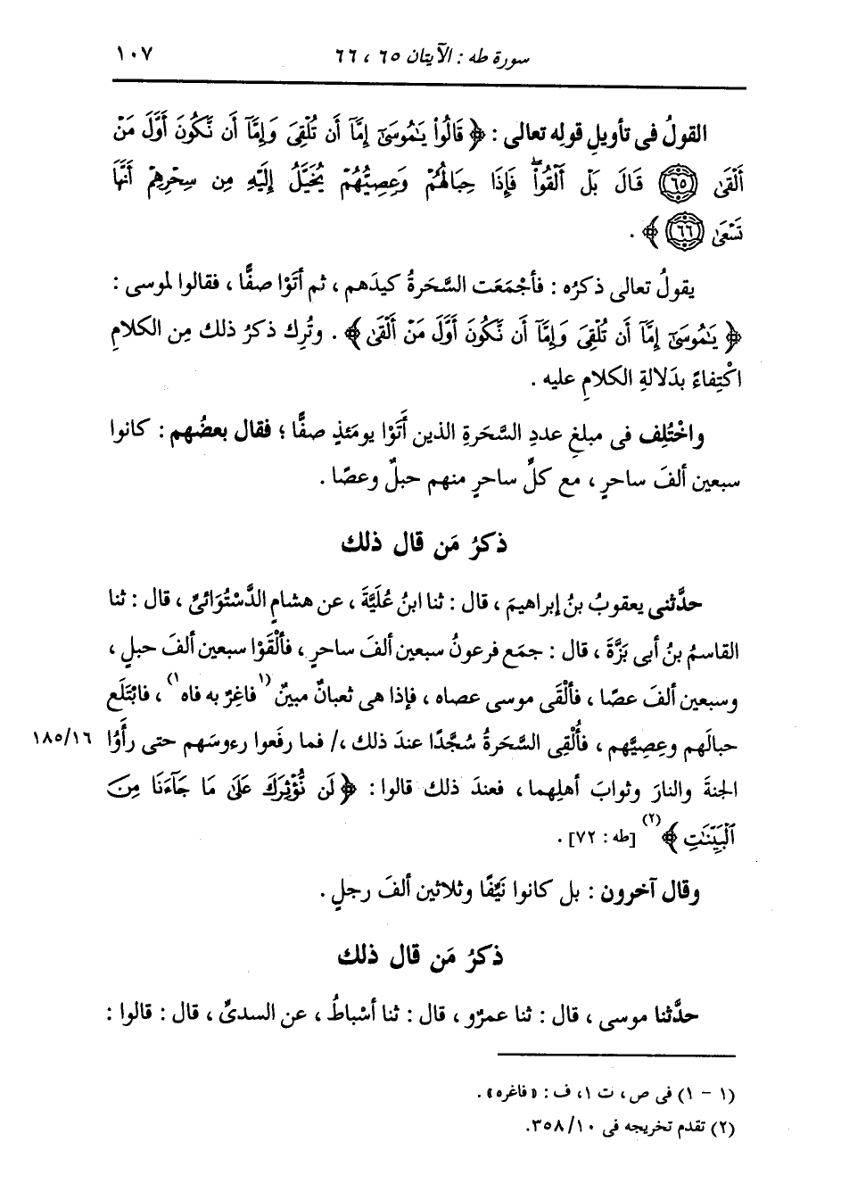 ذِكْرُ مَنْ قَالَ ذَلِكَ: حَدَّثَنَا مُوسَى، قَالَ: ثنا عَمْرٌو، قَالَ: ثنا أَسْبَاطٌ، عَنِ السُّدِّيِّ، قَالَ: {§قَالُوا -[108]- يَا مُوسَى إِمَّا أَنْ تُلْقِيَ وَإِمَّا أَنْ نَكُونَ نَحْنُ الْمُلْقِينَ} [الأعراف: 115] قَالَ لَهُمْ مُوسَى: {أَلْقُوا} [طه: 66] ، فَأُلْقَوْا حِبَالَهُمْ وَعِصِيَّهُمْ، وَكَانُوا بَضْعَةً وَثَلَاثِينَ أَلْفَ رَجُلٍ لَيْسَ مِنْهُمْ رَجُلٌ إِلَّا وَمَعَهُ حَبْلٌ وَعَصًا وَقَالَ آخَرُونَ بَلْ كَانُوا خَمْسَةَ عَشَرَ أَلْفًا