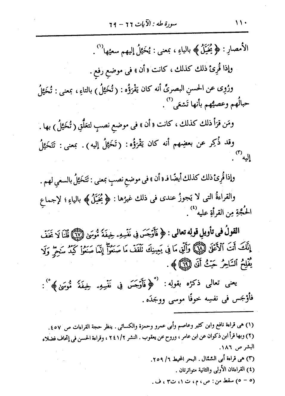 الْأَمْصَارِ {يُخَيَّلُ إِلَيْهِ} [طه: 66] بِالْيَاءِ بِمَعْنَى: يُخَيَّلُ إِلَيْهِمْ سَعْيُهَا. وَإِذَا قُرِئَ ذَلِكَ كَذَلِكَ، كَانَتْ «أَنَّ» فِي مَوْضِعِ رَفْعٍ. وَرُوِي عَنِ الْحَسَنِ الْبَصْرِيِّ أَنَّهُ كَانَ يَقْرَؤُهُ: «تَخَيَّلَ» بِالتَّاءِ، بِمَعْنَى: تَخَيَّلَ حِبَالَهُمْ وَعِصِيَّهُمْ بِأَنَّهَا تَسْعَى. وَمَنْ قَرَأَ ذَلِكَ كَذَلِكَ، كَانَتْ «أَنَّ» فِي مَوْضِعِ نَصْبٍ لِتَعَلُّقِ تَخَيَّلَ بِهَا. وَقَدْ ذُكِرَ عَنْ بَعْضِهِمْ أَنَّهُ كَانَ يَقْرَؤُهُ: «تَخَيَّلُ إِلَيْهِ» بِمَعْنَى: تَتَخَيَّلُ إِلَيْهِ. وَإِذَا قُرِئَ ذَلِكَ كَذَلِكَ أَيْضًا فَـ «أَنَّ» فِي مَوْضِعِ نَصْبٍ بِمَعْنَى: تَتَخَيَّلُ بِالسَّعْي لَهُمْ. وَالْقِرَاءَةُ الَّتِي لَا يَجُوزُ عِنْدِي فِي ذَلِكَ غَيْرُهَا {يُخَيَّلُ} [طه: 66] بِالْيَاءِ لِإِجْمَاعِ الْحُجَّةِ مِنَ الْقُرَّاءِ عَلَيْهِ