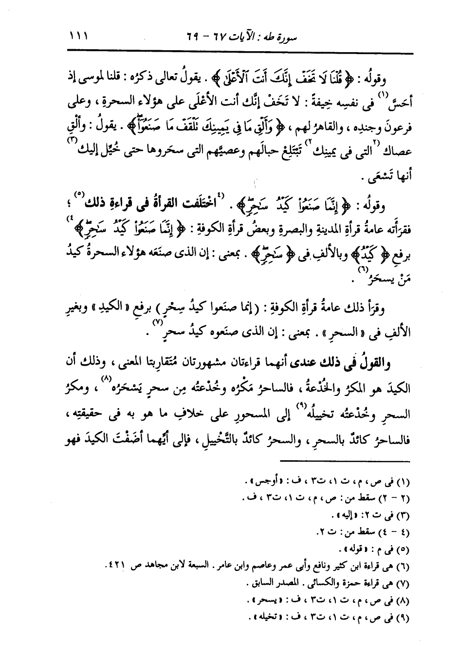 §وَقَوْلُهُ: {إِنَّمَا صَنَعُوا كَيَدُ سَاحِرٍ} [طه: 69] اخْتَلَفَتِ الْقُرَّاءُ فِي قِرَاءَةِ قَوْلِهِ، فَقَرَأَتْهُ عَامَّةُ قُرَّاءِ الْمَدِينَةِ وَالْبَصْرَةِ وَبَعْضُ قُرَّاءِ الْكُوفَةِ {إِنَّمَا صَنَعُوا كَيْدُ سَاحِرٍ} [طه: 69] بِرَفْعِ كَيْدَ وَبِالْأَلِفِ فِي سَاحِرٍ بِمَعْنَى: إِنَّ الَّذِي صَنَعَهُ هَؤُلَاءِ السَّحَرَةُ كَيْدٌ مِنْ سَاحِرٍ. وَقَرَأَ ذَلِكَ عَامَّةُ قُرَّاءِ الْكُوفَةِ: (إِنَّمَا صَنَعُوا كَيْدُ سِحْرٍ) بِرَفْعِ الْكَيْدِ وَبِغَيْرِ الْأَلِفِ فِي السِّحْرِ بِمَعْنَى إِنَّ الَّذِي صَنَعُوهُ كَيْدُ سِحْرٍ. وَالْقَوْلُ فِي ذَلِكَ عِنْدِي أَنَّهُمَا قِرَاءَتَانِ مَشْهُورَتَانِ مُتَقَارِبَتَا الْمَعْنَى، وَذَلِكَ أَنَّ الْكَيْدَ هُوَ الْمَكْرُ وَالْخِدْعَةُ، فَالسَّاحِرُ مَكْرُهُ وَخِدْعَتُهُ مِنْ سِحْرٍ يُسْحَرُ، وَمَكْرُ السِّحْرِ وَخِدْعَتُهُ: تَخَيُّلُهُ إِلَى الْمَسْحُورِ، عَلَى خِلَافِ مَا هُوَ بِهِ فِي حَقِيقَتِهِ، فَالسَّاحِرُ كَائِدٌ بِالسِّحْرِ، وَالسِّحْرُ كَائِدٌ بِالتَّخْيِيلِ، فَإِلَى أَيِّهِمَا أَضَفْتُ الْكَيْدَ فَهُوَ