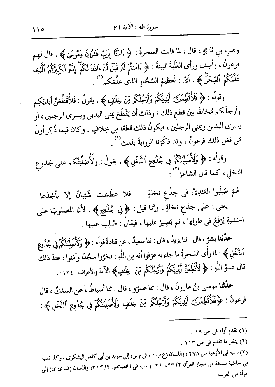 حَدَّثَنَا مُوسَى بْنُ هَارُونَ، قَالَ: ثنا عَمْرٌو، قَالَ: ثنا أَسْبَاطٌ، عَنِ السُّدِّيِّ، قَالَ فِرْعَوْنُ: {§فَلَأُقَطِّعَنَّ أَيْدِيَكُمْ وَأَرْجُلَكُمْ مِنْ خِلَافٍ وَلَأُصَلِّبَنَّكُمْ فِي جُذُوعِ النَّخْلِ} [طه: 71]-[116]- فَقَتَلَهُمْ وَقَطَّعَهُمْ