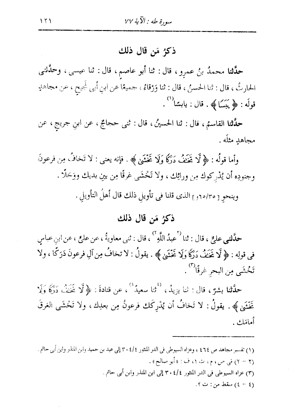 ذِكْرُ مَنْ قَالَ ذَلِكَ: حَدَّثَنِي مُحَمَّدُ بْنُ عَمْرٍو، قَالَ: ثنا أَبُو عَاصِمٍ، قَالَ: ثنا عِيسَى، وَحَدَّثَنِي الْحَارِثُ، قَالَ: ثنا الْحَسَنُ، قَالَ: ثنا وَرْقَاءُ، جَمِيعًا عَنِ ابْنِ أَبِي نَجِيحٍ، عَنْ مُجَاهِدٍ، قَوْلُهُ {§يَبَسًا} [طه: 77] قَالَ: يَابِسًا حَدَّثَنَا الْقَاسِمُ، قَالَ: ثنا الْحُسَيْنُ، قَالَ: ثني حَجَّاجٌ، عَنِ ابْنِ جُرَيْجٍ، عَنْ مُجَاهِدٍ، مِثْلَهُ