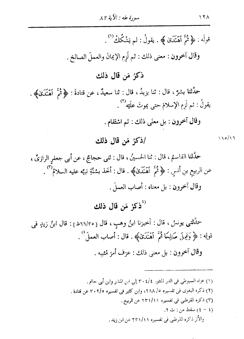 ذِكْرُ مَنْ قَالَ ذَلِكَ: حَدَّثَنَا الْقَاسِمُ، قَالَ: ثنا الْحُسَيْنُ، قَالَ: ثني حَجَّاجٌ، عَنْ أَبِي جَعْفَرٍ الرَّازِيِّ، عَنِ الرَّبِيعِ بْنِ أَنَسٍ، {§ثُمَّ اهْتَدَى} [طه: 82] قَالَ: أَخَذَ بِسُنَّةِ نَبِيِّهِ صَلَّى اللهُ عَلَيْهِ وَسَلَّمَ وَقَالَ آخَرُونَ: بَلْ مَعْنَاهُ: أَصَابَ الْعَمَلَ