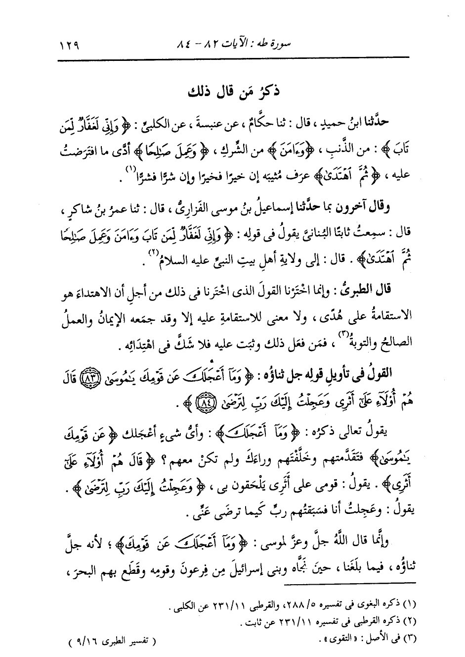 بِمَا: حَدَّثَنَا إِسْمَاعِيلُ بْنُ مُوسَى الْفَزَارِيُّ، قَالَ: أَخْبَرَنَا عُمَرُ بْنُ شَاكِرٍ، قَالَ: سَمِعْتُ ثَابِتًا الْبُنَانِيَّ، يَقُولُ فِي قَوْلِهِ: {§وَإِنِّي لَغَفَّارٌ لِمَنْ تَابَ وَآمَنَ وَعَمِلَ صَالِحًا ثُمَّ اهْتَدَى} [طه: 82] قَالَ: إِلَى وِلَايَةِ أَهْلِ بَيْتِ النَّبِيِّ صَلَّى اللهُ عَلَيْهِ وَسَلَّمَ قَالَ أَبُو جَعْفَرٍ: وَإِنَّمَا اخْتَرْنَا الْقَوْلَ الَّذِي اخْتَرْنَا فِي ذَلِكَ، مِنْ أَجْلِ أَنَّ الِاهْتِدَاءَ هُوَ الِاسْتِقَامَةُ عَلَى هُدًى، وَلَا مَعْنَى لِلِاسْتِقَامَةِ عَلَيْهِ إِلَّا وَقَدْ جَمَعَهُ الْإِيمَانُ وَالْعَمَلُ الصَّالِحُ وَالتَّوْبَةُ، فَمَنْ فَعَلَ ذَلِكَ وَثَبَتَ عَلَيْهِ، فَلَا شَكَّ فِي اهْتِدَائِهِ