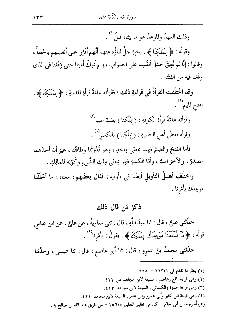 §وَقَوْلُهُ: {بِمَلْكِنَا} [طه: 87] يُخْبِرُ جَلَّ ذِكْرُهُ عَنْهُمْ أَنَّهُمْ أَقَرُّوا عَلَى أَنْفُسِهِمْ بِالْخَطَأِ، وَقَالُوا: إِنَّا لَمْ نَطِقْ حَمْلَ أَنْفُسِنَا عَلَى الصَّوَابِ، وَلَمْ نَمْلِكْ أَمْرَنَا حَتَّى وَقَعْنَا فِي الَّذِي وَقَعْنَا فِيهِ مِنَ الْفِتْنَةِ. وَقَدِ اخْتَلَفَتِ الْقُرَّاءُ فِي قِرَاءَةِ ذَلِكَ، فَقَرَأَتْهُ عَامَّةُ قُرَّاءِ الْمَدِينَةِ: { «بِمَلْكِنَا» } [طه: 87] بِفَتْحِ الْمِيمِ، وَقَرَأَتْهُ عَامَّةُ قُرَّاءِ الْكُوفَةِ: (بِمُلْكِنَا) بِضَمِّ الْمِيمِ، وَقَرَأَهُ بَعْضُ أَهْلِ الْبَصْرَةِ: (بِمِلْكِنَا) بِالْكَسْرِ. فَأَمَّا الْفَتْحُ وَالضَّمُّ فَهُمَا بِمَعْنًى وَاحِدٍ، وَهُمَا بِقُدْرَتِنَا وَطَاقَتِنَا، غَيْرَ أَنَّ أَحَدَهُمَا مَصْدَرٌ، وَالْآخَرُ اسْمٌ، وَأَمَّا الْكَسْرُ فَهُوَ بِمَعْنَى مِلْكِ الشَّيْءِ وَكَوْنِهِ لِلْمَالِكِ. وَاخْتَلَفَ أَيْضًا أَهْلُ التَّأْوِيلِ فِي تَأْوِيلِهِ، فَقَالَ بَعْضُهُمْ: مَعْنَاهُ: مَا أَخْلَفْنَا مَوْعِدَكَ بِأَمْرِنَا