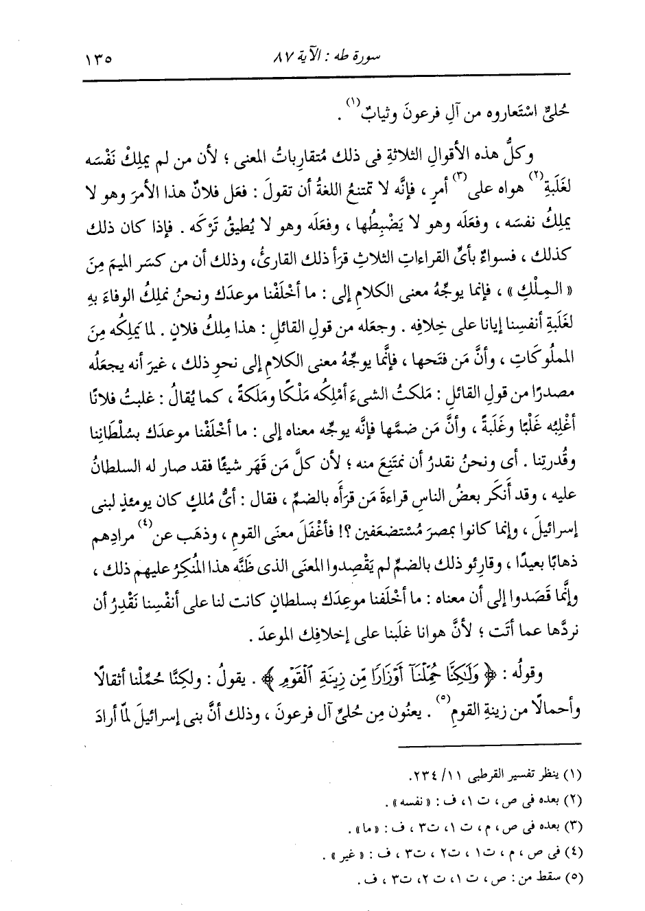 حُلِيُّ اسْتَعَارُوهُ مِنْ آلِ فِرْعَوْنَ وَثِيَابٌ وَقَالَ أَبُو جَعْفَرٍ: وَكُلُّ هَذِهِ الْأَقْوَالِ الثَّلَاثَةِ فِي ذَلِكَ مُتَقَارِبَاتُ الْمَعْنَى، لِأَنَّ مَنْ لَمْ يُهْلِكْ نَفْسَهُ، لِغَلَبَةِ هَوَاهُ عَلَى مَا أَمَرَ، فَإِنَّهُ لَا يَمْتَنِعُ فِي اللُّغَةِ أَنْ يَقُولَ: فَعَلَ فُلَانٌ هَذَا الْأَمْرَ، وَهُوَ لَا يَمْلِكُ نَفْسَهُ وَفِعْلَهُ، وَهُوَ لَا يَضْبِطُهَا وَفِعْلَهُ، وَهُوَ لَا يُطِيقُ تَرْكَهُ. فَإِذَا كَانَ ذَلِكَ كَذَلِكَ، فَسَوَاءٌ بِأَيِّ الْقِرَاءَاتِ الثَّلَاثِ قَرَأَ ذَلِكَ الْقَارِئُ، وَذَلِكَ أَنَّ مَنْ كَسَرَ الْمِيمَ مِنَ الْمِلْكِ، فَإِنَّمَا يُوَجِّهُ مَعْنَى الْكَلَامِ إِلَى مَا أَخْلَفْنَا مَوْعِدَكَ وَنَحْنُ نَمْلِكُ الْوَفَاءَ بِهِ لِغَلَبَةِ أَنْفُسِنَا إِيَّانَا عَلَى خِلَافِهِ، وَجَعَلَهُ مِنْ قَوْلِ الْقَائِلِ: هَذَا مِلْكُ فُلَانٍ لِمَا يَمْلِكُهُ مِنَ الْمَمْلُوكَاتِ، وَأَنَّ مَنْ فَتَحَهَا، فَإِنَّهُ يُوَجِّهُ مَعْنَى الْكَلَامِ إِلَى نَحْوِ ذَلِكَ، غَيْرَ أَنَّهُ يَجْعَلُهُ مَصْدَرًا مِنْ قَوْلِ الْقَائِلِ: مَلَكْتُ الشَّيْءَ أَمْلِكُهُ مَلْكًا وَمَلْكَةً، كَمَا يُقَالُ: غَلَبْتُ فُلَانًا أَغْلِبُهُ غَلْبًا وَغَلْبَةً، وَأَنَّ مَنْ ضَمَّهَا فَإِنَّهُ وَجَّهُ مَعْنَاهُ إِلَى مَا أَخْلَفْنَا مَوْعِدَكَ بِسُلْطَانِنَا وَقُدْرَتِنَا، أَيْ وَنَحْنُ نَقْدِرُ أَنْ نَمْتَنِعَ مِنْهُ، لِأَنَّ كُلَّ مَنْ قَهَرَ شَيْئًا فَقَدْ صَارَ لَهُ السُّلْطَانُ عَلَيْهِ. وَقَدْ أَنْكَرَ بَعْضُ النَّاسِ قِرَاءَةَ مَنْ قَرَأَهُ بِالضَّمِّ، فَقَالَ: أَيُّ مُلْكٍ كَانَ يَوْمَئِذٍ لِبَنِي إِسْرَائِيلَ، وَإِنَّمَا كَانُوا بِمِصْرَ مُسْتَضْعَفِينَ، فَأَغْفَلَ مَعْنَى الْقَوْمِ وَذَهَبَ غَيْرُ مُرَادِهِمْ ذَهَابًا بَعِيدًا، وَقَارِئُو ذَلِكَ بِالضَّمِّ لَمْ يَقْصِدُوا الْمَعْنَى الَّذِي ظَنَّهُ هَذَا الْمُنْكِرُ عَلَيْهِمْ ذَلِكَ، وَإِنَّمَا قَصَدُوا إِلَى أَنَّ مَعْنَاهُ: مَا أَخْلَفْنَا مَوْعِدَكَ بِسُلْطَانٍ كَانَتْ لَنَا عَلَى أَنْفُسِنَا نَقْدِرُ أَنْ نَرُدَّهَا عَمَّا أَتَتْ، لِأَنَّ هَوَاهَا غَلَبَنَا عَلَى إِخْلَافِكَ الْمَوْعِدَ