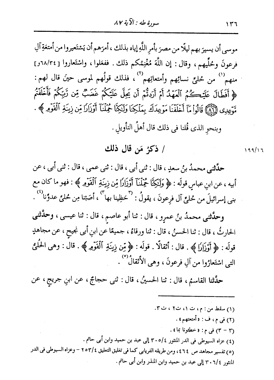 حَدَّثَنَا الْقَاسِمُ، قَالَ: ثنا الْحُسَيْنُ، قَالَ: ثني حَجَّاجٌ، عَنِ ابْنِ جُرَيْجٍ، عَنْ -[137]- مُجَاهِدٍ {§وَلَكِنَّا حُمِّلْنَا أَوْزَارًا} [طه: 87] قَالَ: أَثْقَالًا {مِنْ زِينَةِ الْقَوْمِ} [طه: 87] قَالَ: حُلِيِّهِمْ