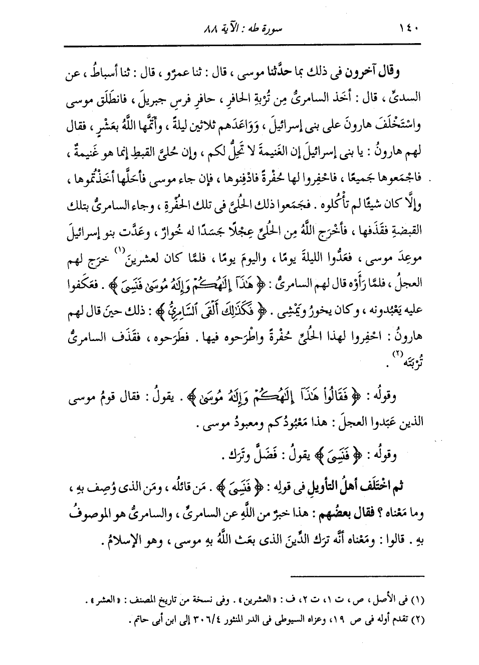 §وَقَوْلُهُ: {فَقَالُوا هَذَا إِلَهُكُمْ وَإِلَهُ مُوسَى} [طه: 88] يَقُولُ: فَقَالَ قَوْمُ مُوسَى الَّذِينَ عَبَدُوا الْعِجْلَ: هَذَا مَعْبُودُكُمْ وَمَعْبُودُ مُوسَى. وَقَوْلُهُ {فَنَسِيَ} [طه: 88] يَقُولُ: فَضَلَّ وَتَرَكَ. ثُمَّ اخْتَلَفَ أَهْلُ التَّأْوِيلِ فِي قَوْلِهِ {فَنَسِيَ} [طه: 88] مَنْ قَائِلُهُ وَمَنِ الَّذِي وُصِفَ بِهِ وَمَا مَعْنَاهُ، فَقَالَ بَعْضُهُمْ: هَذَا مِنَ اللَّهِ خَبَرٌ عَنِ السَّامِرِيِّ، وَالسَّامِرِيُّ هُوَ الْمَوْصُوفُ بِهِ، وَقَالُوا: مَعْنَاهُ: أَنَّهُ تَرَكَ الدِّينَ الَّذِي بَعَثَ اللَّهُ بِهِ مُوسَى وَهُوَ الْإِسْلَامُ