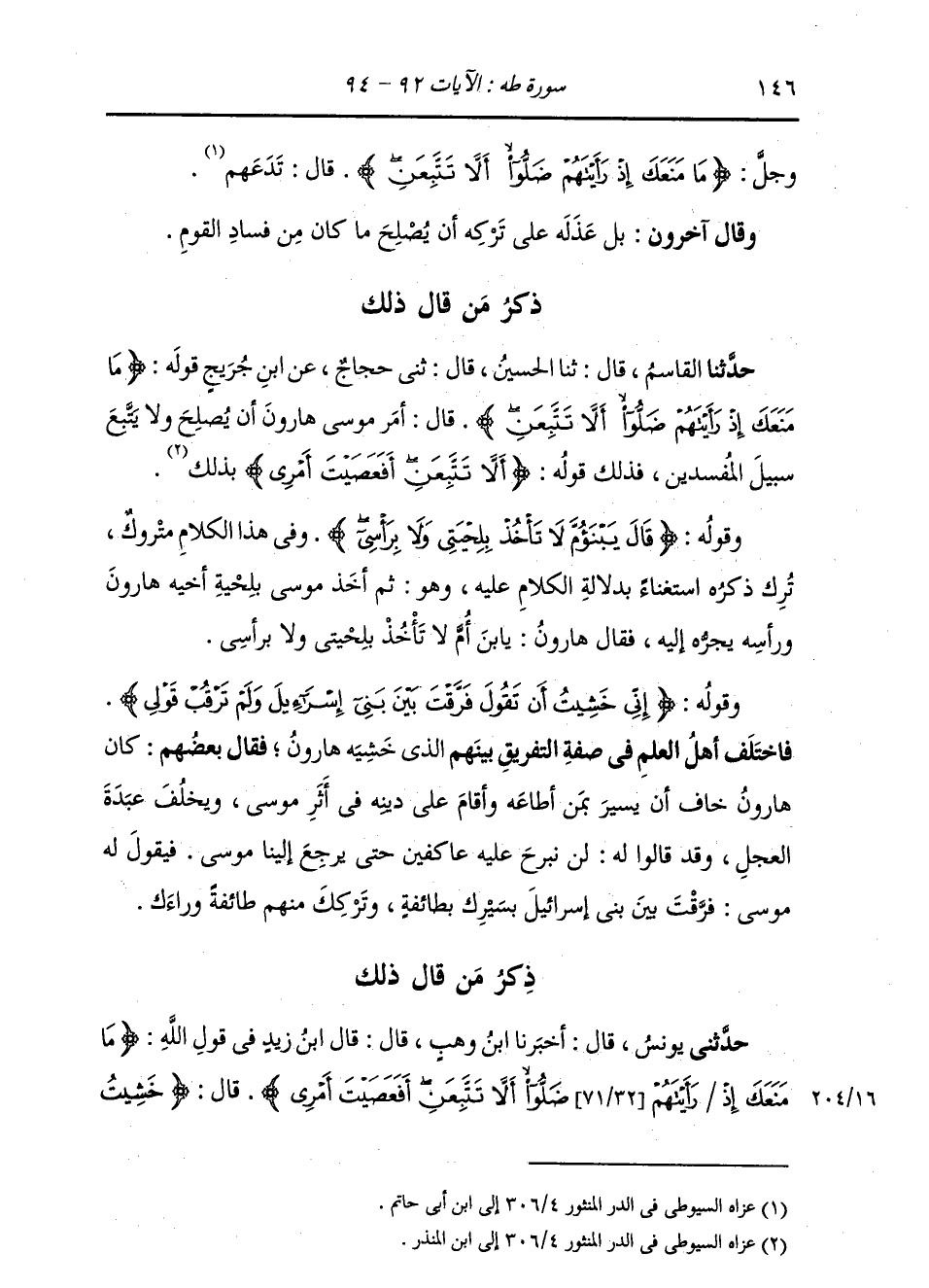 ذِكْرُ مَنْ قَالَ ذَلِكَ: حَدَّثَنَا الْقَاسِمُ، قَالَ: ثنا الْحُسَيْنُ، قَالَ: ثني حَجَّاجٌ، عَنِ ابْنِ جُرَيْجٍ، قَوْلُهُ: {§مَا مَنَعَكَ إِذْ رَأَيْتَهُمْ ضَلُّوا أَلَّا تَتَّبِعَنِ} [طه: 93] قَالَ: أَمَرَ مُوسَى هَارُونَ أَنْ يُصْلِحَ، وَلَا يَتَّبِعَ سَبِيلَ الْمُفْسِدِينِ، فَذَلِكَ قَوْلُهُ: {أَلَّا تَتَّبِعَنِ أَفَعَصَيْتَ أَمْرِي} [طه: 93] بِذَلِكَ، وَقَوْلُهُ: {قَالَ يَا ابْنَ أُمَّ لَا تَأْخُذْ بِلِحْيَتِي وَلَا بِرَأْسِي} [طه: 94] وَفِي هَذَا الْكَلَامِ مَتْرُوكٌ، تُرِكَ ذِكْرُهُ اسْتِغْنَاءً بِدَلَالَةِ الْكَلَامِ عَلَيْهِ، وَهُوَ: ثُمَّ أَخَذَ مُوسَى بِلِحْيَةِ أَخِيهِ هَارُونَ وَرَأْسُهُ يَجُرُّهُ إِلَيْهِ، فَقَالَ هَارُونُ: {يَا ابْنَ أُمَّ لَا تَأْخُذْ بِلِحْيَتِي وَلَا بِرَأْسِي} [طه: 94]