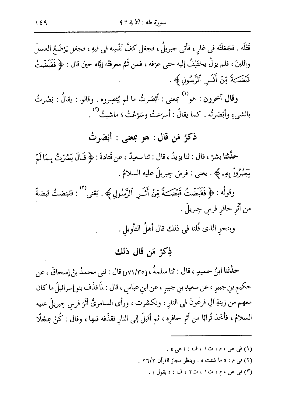 §وَقَوْلُهُ: {فَقَبَضْتُ قَبْضَةً مِنْ أَثَرِ الرَّسُولِ} [طه: 96] يَقُولُ: قَبَضْتُ قَبْضَةً مِنْ أَثَرِ حَافِرِ فَرَسِ جَبْرئِيلَ. وَبِنَحْوِ الَّذِي قُلْنَا فِي ذَلِكَ قَالَ أَهْلُ التَّأْوِيلِ