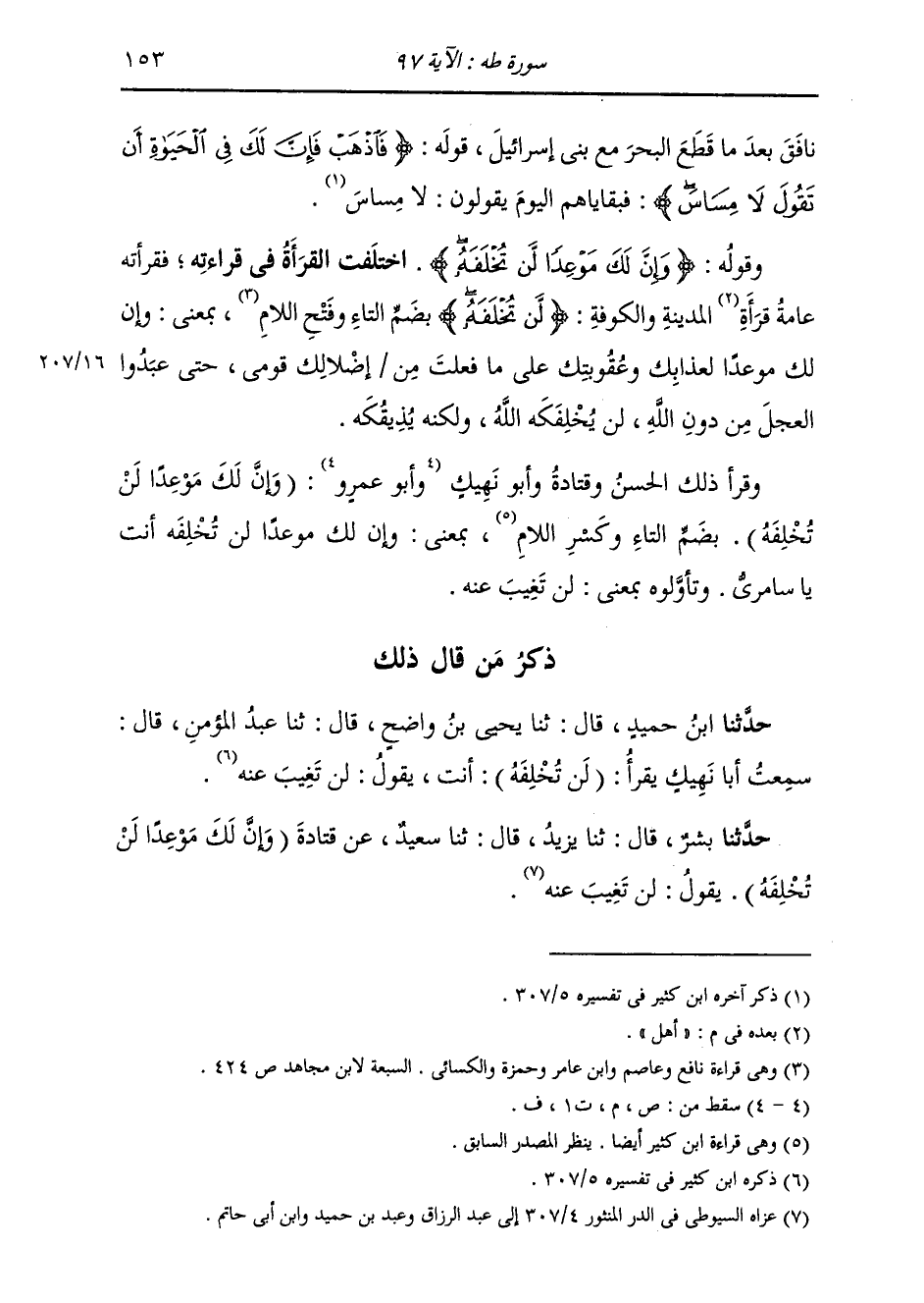 §وَقَوْلُهُ: {وَإِنَّ لَكَ مَوْعِدًا لَنْ تُخْلَفَهُ} [طه: 97] اخْتَلَفَتِ الْقُرَّاءُ فِي قِرَاءَتِهِ، فَقَرَأَتْهُ عَامَّةُ قُرَّاءِ أَهْلِ الْمَدِينَةِ وَالْكُوفَةِ {لَنْ تُخْلَفَهُ} [طه: 97] بِضَمِّ التَّاءِ وَفَتْحِ اللَّامِ بِمَعْنًى: وَإِنَّ لَكَ مَوْعِدًا لِعَذَابِكَ وَعُقُوبَتِكَ عَلَى مَا فَعَلْتَ مِنْ إِضْلَالِكَ قَوْمِي حَتَّى عَبَدُوا الْعِجْلَ مِنْ دُونِ اللَّهِ، لَنْ يُخْلِفَكَهُ اللَّهُ، وَلَكِنْ يُذِيقَكَهُ. وَقَرَأَ ذَلِكَ الْحَسَنُ وَقَتَادَةُ وَأَبُو نَهِيكٍ: (وَإِنَّ لَكَ مَوْعِدًا لَنْ تُخْلِفَهُ) بِضَمِّ التَّاءِ وَكَسْرِ اللَّامِ، بِمَعْنَى: وَإِنَّ لَكَ مَوْعِدًا لَنْ تُخْلِفَهُ أَنْتَ يَا سَامِرِيُّ، وَتَأَوَّلُوهُ بِمَعْنَى: لَنْ تَغِيبَ عَنْهُ