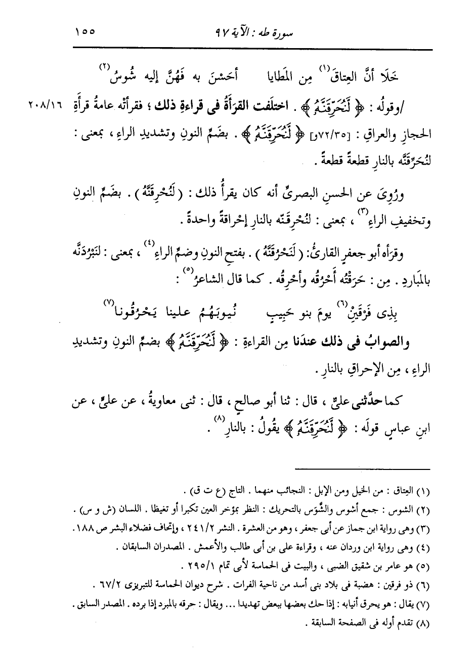 §وَقَوْلُهُ: {لَنُحَرِّقَنَّهُ} [طه: 97] اخْتَلَفَتِ الْقُرَّاءُ فِي قِرَاءَةِ ذَلِكَ، فَقَرَأَتْهُ عَامَّةُ قُرَّاءِ الْحِجَازِ وَالْعِرَاقِ {لَنُحَرِّقَنَّهُ} [طه: 97] بِضَمِّ النُّونِ وَتَشْدِيدِ الرَّاءِ، بِمَعْنَى لَنُحَرِّقَنَّهُ بِالنَّارِ قِطْعَةً قِطْعَةً. وَرُوِي عَنِ الْحَسَنِ الْبَصْرِيِّ أَنَّهُ كَانَ يَقْرَأُ ذَلِكَ: «لَنُحْرِقَنَّهُ» بِضَمِّ النُّونِ، وَتَخْفِيفِ الرَّاءِ، بِمَعْنَى: لَنُحَرِّقَنَّهُ بِالنَّارِ إِحْرَاقَةً وَاحِدَةً، وَقَرَأَهُ أَبُو جَعْفَرٍ الْقَارِئُ: (لَنَحْرُقَنَّهُ) بِفَتْحِ النُّونِ وَضَمِّ الرَّاءِ بِمَعْنَى: لَنَبْرُدَنَّهُ بِالْمَبَارِدِ مِنْ حَرَقْتُهُ أَحْرُقُهُ وَأَحْرِقُهُ، كَمَا قَالَ الشَّاعِرُ: