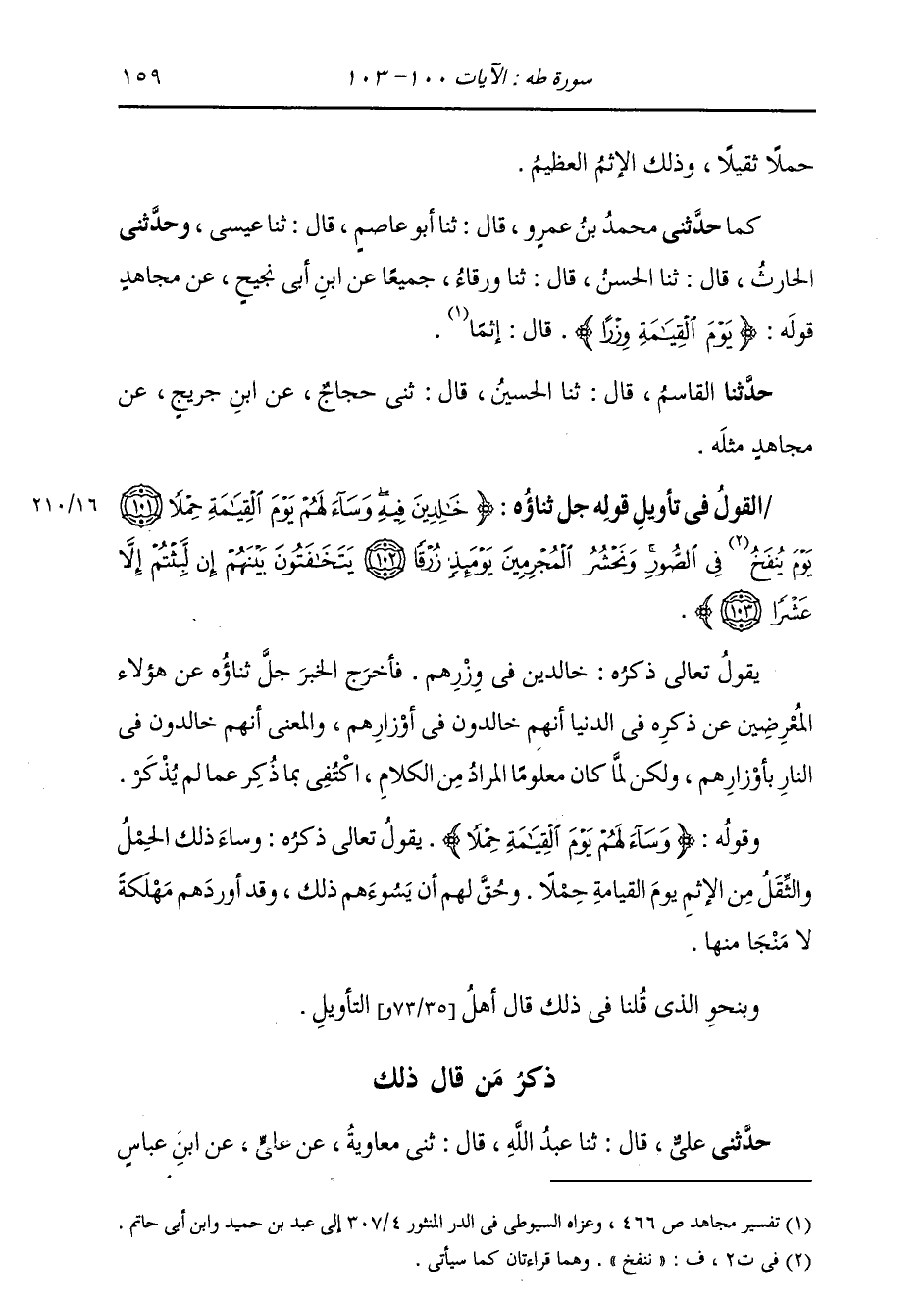 كَمَا: حَدَّثَنِي مُحَمَّدُ بْنُ عَمْرٍو، قَالَ: ثنا أَبُو عَاصِمٍ، قَالَ: ثنا عِيسَى، وَحَدَّثَنِي الْحَارِثُ، قَالَ: ثنا الْحَسَنُ، قَالَ: ثنا وَرْقَاءُ، جَمِيعًا عَنِ ابْنِ أَبِي نَجِيحٍ، عَنْ مُجَاهِدٍ، قَوْلُهُ: {§يَوْمَ الْقِيَامَةِ وِزْرًا} [طه: 100] قَالَ: إِثْمًا حَدَّثَنَا الْقَاسِمُ، قَالَ: ثنا الْحُسَيْنُ، قَالَ: ثني حَجَّاجٌ. عَنِ ابْنِ جُرَيْجٍ، عَنْ مُجَاهِدٍ، مِثْلَهُ