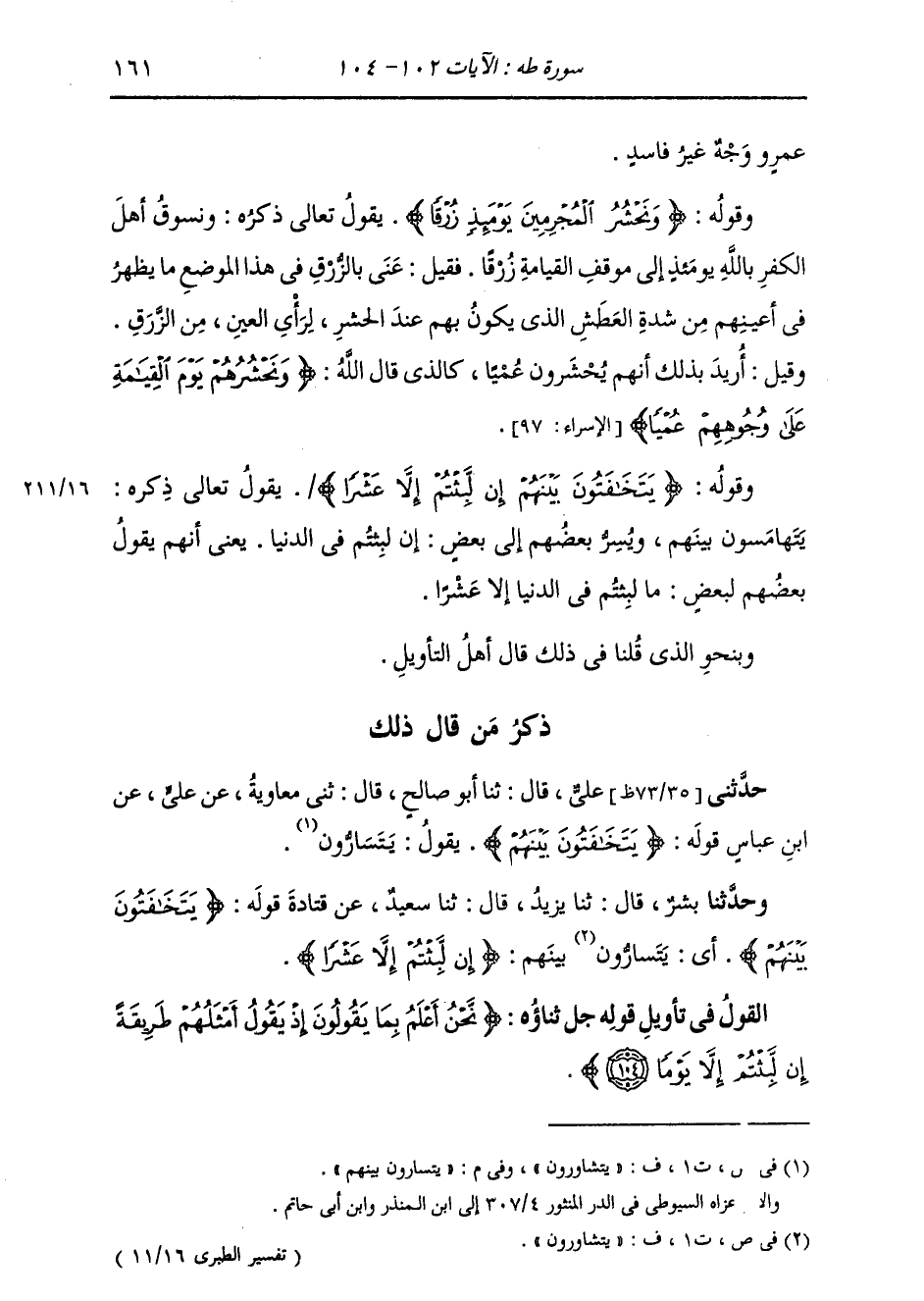 §الْقَوْلُ فِي تَأْوِيلِ قَوْلِهِ تَعَالَى: {نَحْنُ أَعْلَمُ بِمَا يَقُولُونَ إِذْ يَقُولُ أَمْثَلُهُمْ طَرِيقَةً إِنْ لَبِثْتُمْ إِلَّا يَوْمًا} [طه: 104]-[162]- يَقُولُ تَعَالَى ذِكْرُهُ: نَحْنُ أَعْلَمُ مِنْهُمْ عِنْدَ إِسْرَارِهِمْ وَتَخَافُتِهِمْ بَيْنَهُمْ بِقِيلِهِمْ {إِنْ لَبِثْتُمْ إِلَّا عَشْرًا} [طه: 103] بِمَا يَقُولُونَ لَا يَخْفَى عَلَيْنَا مِمَّا يَتَسَارَرُونَهُ بَيْنَهُمْ شَيْءٌ {إِذْ يَقُولُ أَمْثَلُهُمْ طَرِيقَةً إِنْ لَبِثْتُمْ إِلَّا يَوْمًا} [طه: 104] يَقُولُ تَعَالَى ذِكْرُهُ حِينَ يَقُولُ أَوْفَاهُمْ عَقْلًا، وَأَعْلَمُهُمْ فِيهِمْ: إِنْ لَبِثْتُمْ فِي الدُّنْيَا إِلَّا يَوْمًا. وَبِنَحْوِ الَّذِي قُلْنَا فِي ذَلِكَ، قَالَ أَهْلُ التَّأْوِيلِ