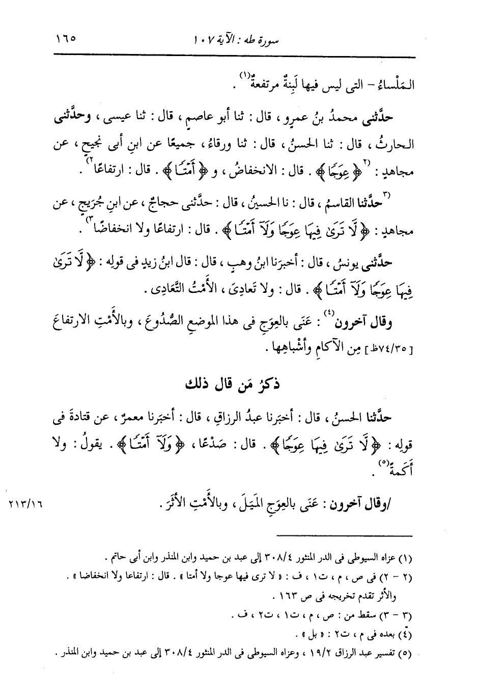 حَدَّثَنِي مُحَمَّدُ بْنُ عَمْرٍو، قَالَ: ثنا أَبُو عَاصِمٍ، قَالَ: ثنا عِيسَى، وَحَدَّثَنِي الْحَارِثُ، قَالَ: ثنا الْحَسَنُ، قَالَ: ثنا وَرْقَاءُ، جَمِيعًا عَنِ ابْنِ أَبِي نَجِيحٍ، عَنْ مُجَاهِدٍ، {§لَا تَرَى فِيهَا عِوَجًا وَلَا أَمْتًا} [طه: 107] قَالَ: ارْتِفَاعًا، وَلَا انْخِفَاضًا
