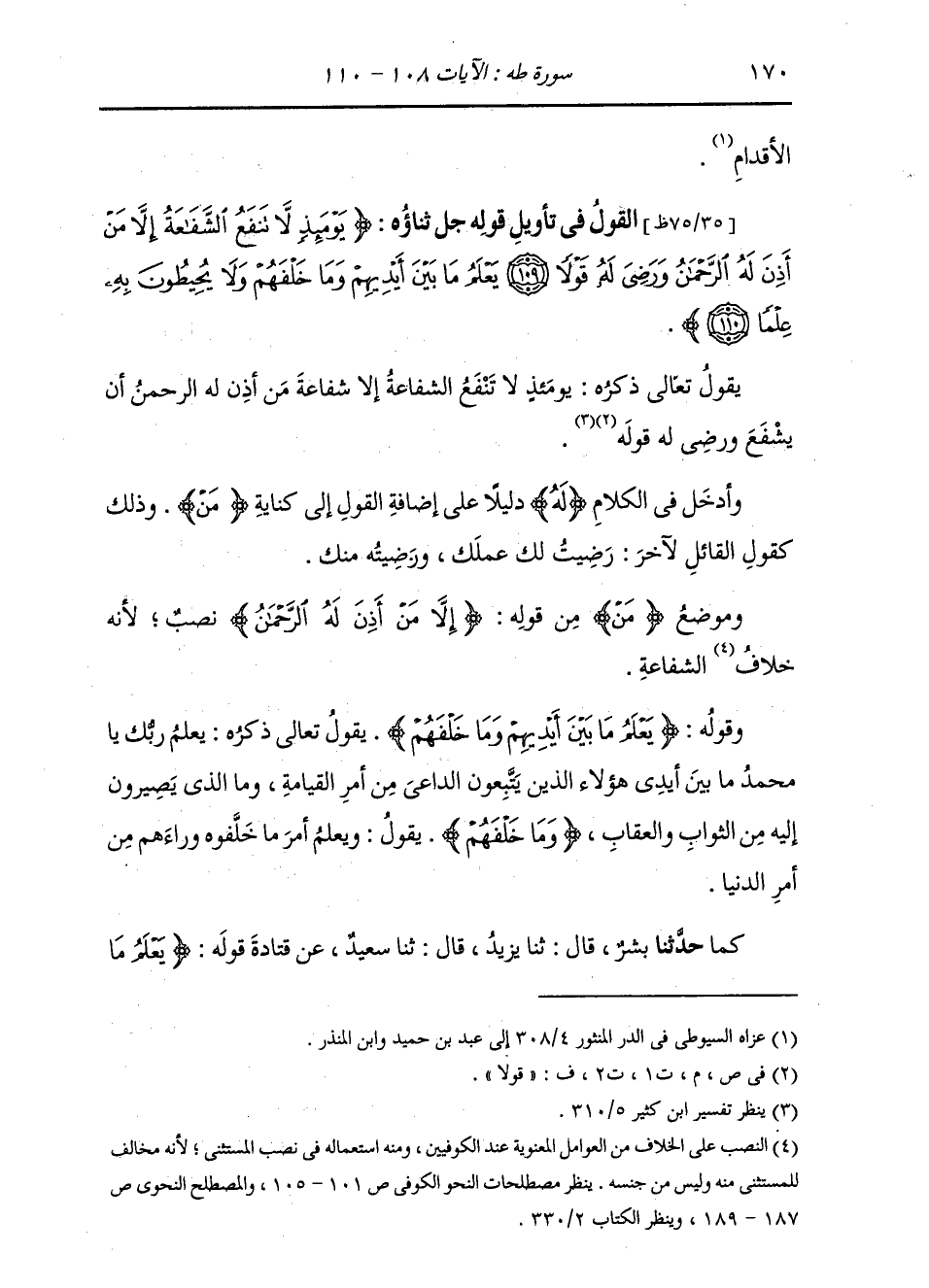 §الْقَوْلُ فِي تَأْوِيلِ قَوْلِهِ تَعَالَى: {يَوْمَئِذٍ لَّا تَنْفَعُ الشَّفَاعَةُ إِلَّا مَنْ أَذِنَ لَهُ الرَّحْمَنُ وَرَضِيَ لَهُ قَوْلًا يَعْلَمُ مَا بَيْنَ أَيْدِيهِمْ وَمَا خَلْفَهُمْ وَلَا يُحِيطُونَ بِهِ عِلْمًا} [طه: 110] يَقُولُ تَعَالَى ذِكْرُهُ {يَوْمَئِذٍ لَا تَنْفَعُ الشَّفَاعَةُ إِلَّا} [طه: 109] شَفَاعَةُ {مَنْ أَذِنَ لَهُ الرَّحْمَنُ} [طه: 109] أَنْ يَشْفَعَ {وَرَضِيَ لَهُ قَوْلًا} [طه: 109] وَأَدْخَلَ فِي الْكَلَامِ لَهُ دَلِيلًا عَلَى إِضَافَةِ الْقَوْلِ إِلَى كِنَايَةٍ «مِنْ» وَذَلِكَ كَقَوْلِ الْقَاتِلِ الْآخَرِ: رَضِيتُ لَكَ عَمَلَكَ، وَرَضِيتُهُ مِنْكَ، وَمَوْضِعُ مَنْ مِنْ قَوْلِهِ {إِلَّا مَنْ أَذِنَ لَهُ} [طه: 109] نَصْبٌ لِأَنَّهُ خِلَافُ الشَّفَاعَةِ