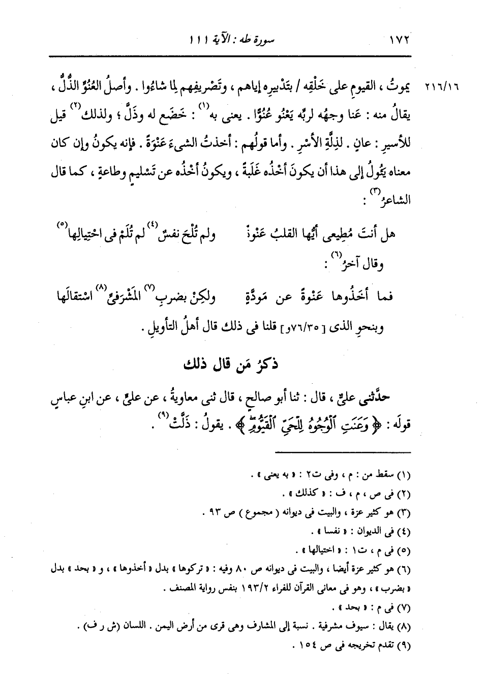 ذِكْرُ مَنْ قَالَ ذَلِكَ: حَدَّثَنِي عَلِيٌّ، قَالَ: ثنا أَبُو صَالِحٍ، قَالَ: ثني مُعَاوِيَةُ، عَنْ عَلِيٍّ، عَنِ ابْنِ عَبَّاسٍ، قَوْلُهُ: {§وَعَنَتِ الْوُجُوهُ لِلْحَيِّ الْقَيُّومِ} [طه: 111] يَقُولُ: ذَلَّتْ