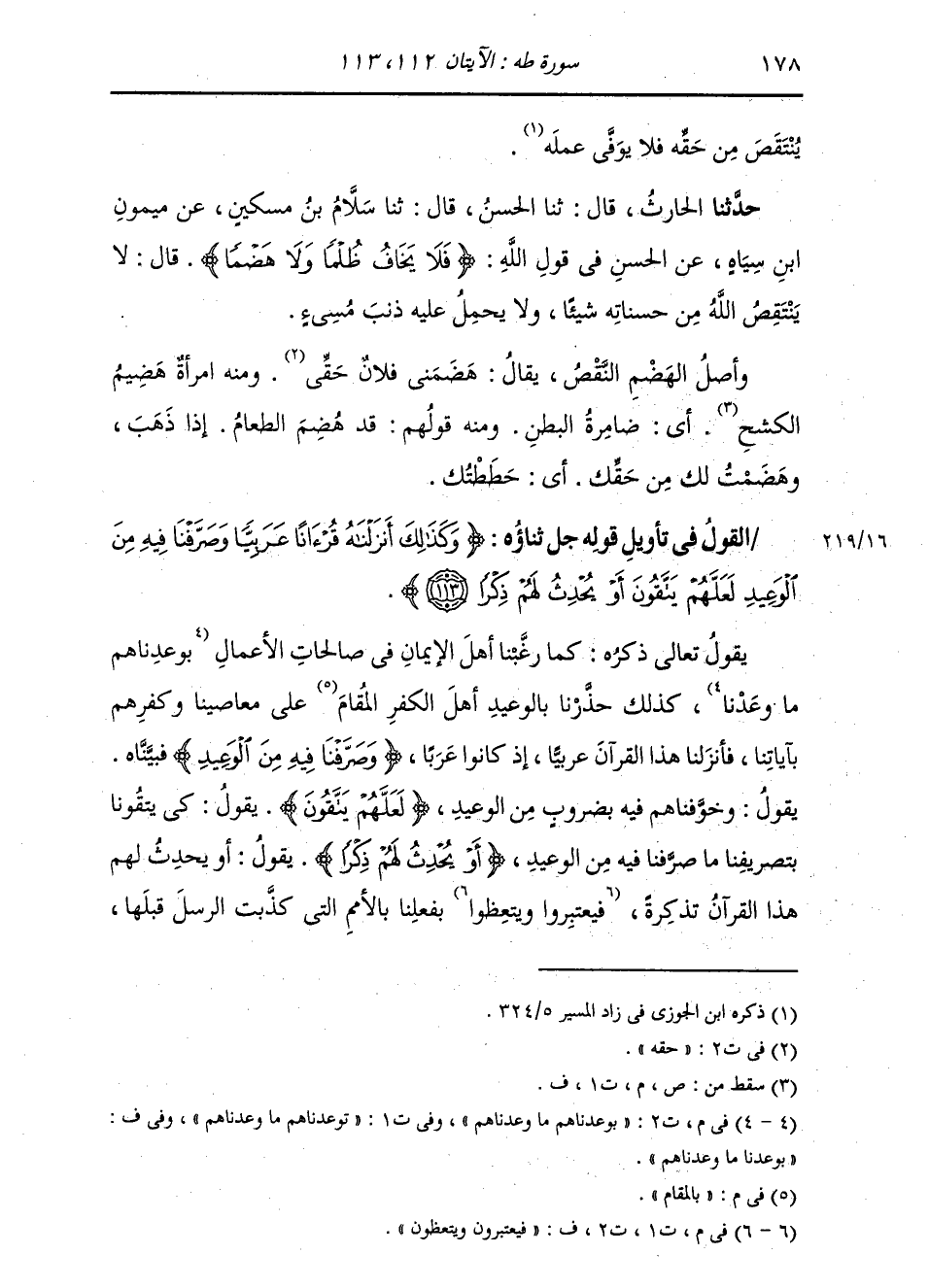 حَدَّثَنَا الْحَارِثُ، قَالَ: ثنا الْحَسَنُ، قَالَ: ثنا سَلَّامُ بْنُ مِسْكِينٍ، عَنْ مَيْمُونِ بْنِ سِيَاهٍ، عَنِ الْحَسَنِ، فِي قَوْلِ اللَّهِ تَعَالَى: {§فَلَا يَخَافُ ظُلْمًا وَلَا هَضْمًا} [طه: 112] قَالَ: لَا يَنْتَقِصُ اللَّهُ مِنْ حَسَنَاتِهِ شَيْئًا، وَلَا يَحْمِلُ عَلَيْهِ ذَنْبَ مُسِيءٍ وَأَصْلُ الْهَضْمِ: النَّقْصُ، يُقَالُ: هَضَمَنِي فُلَانٌ حَقِّي، وَمِنْهُ امْرَأَةٌ هَضِيمٌ: أَيْ ضَامِرَةُ الْبَطْنِ، وَمِنْهُ قَوْلُهُمْ: قَدْ هُضِمَ الطَّعَامُ: إِذَا ذَهَبَ، وَهَضَمْتُ لَكَ مِنْ حَقِّكَ: أَيْ حَطَطْتُكَ
