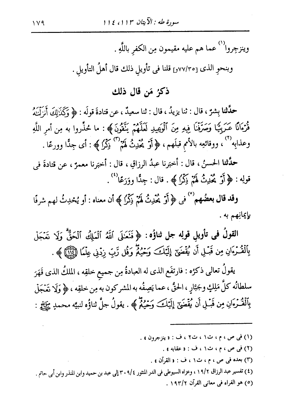 ذِكْرُ مَنْ قَالَ ذَلِكَ: حَدَّثَنَا بِشْرٌ، قَالَ: ثنا يَزِيدُ، قَالَ: ثنا سَعِيدٌ، عَنْ قَتَادَةَ، {§وَكَذَلِكَ أَنْزَلْنَاهُ قُرْآنًا عَرَبِيًّا وَصَرَّفْنَا فِيهِ مِنَ الْوَعِيدِ لَعَلَّهُمْ يَتَّقُونَ} [طه: 113] مَا حُذِّرُوا بِهِ مِنْ أَمْرِ اللَّهِ وَعِقَابِهِ، وَوَقَائِعِهِ بِالْأُمَمِ قَبْلَهُمْ {أَوْ يُحْدِثُ لَهُمْ} [طه: 113] الْقُرْآنُ {ذِكْرًا} [البقرة: 200] أَيْ جِدًّا وَوَرَعًا