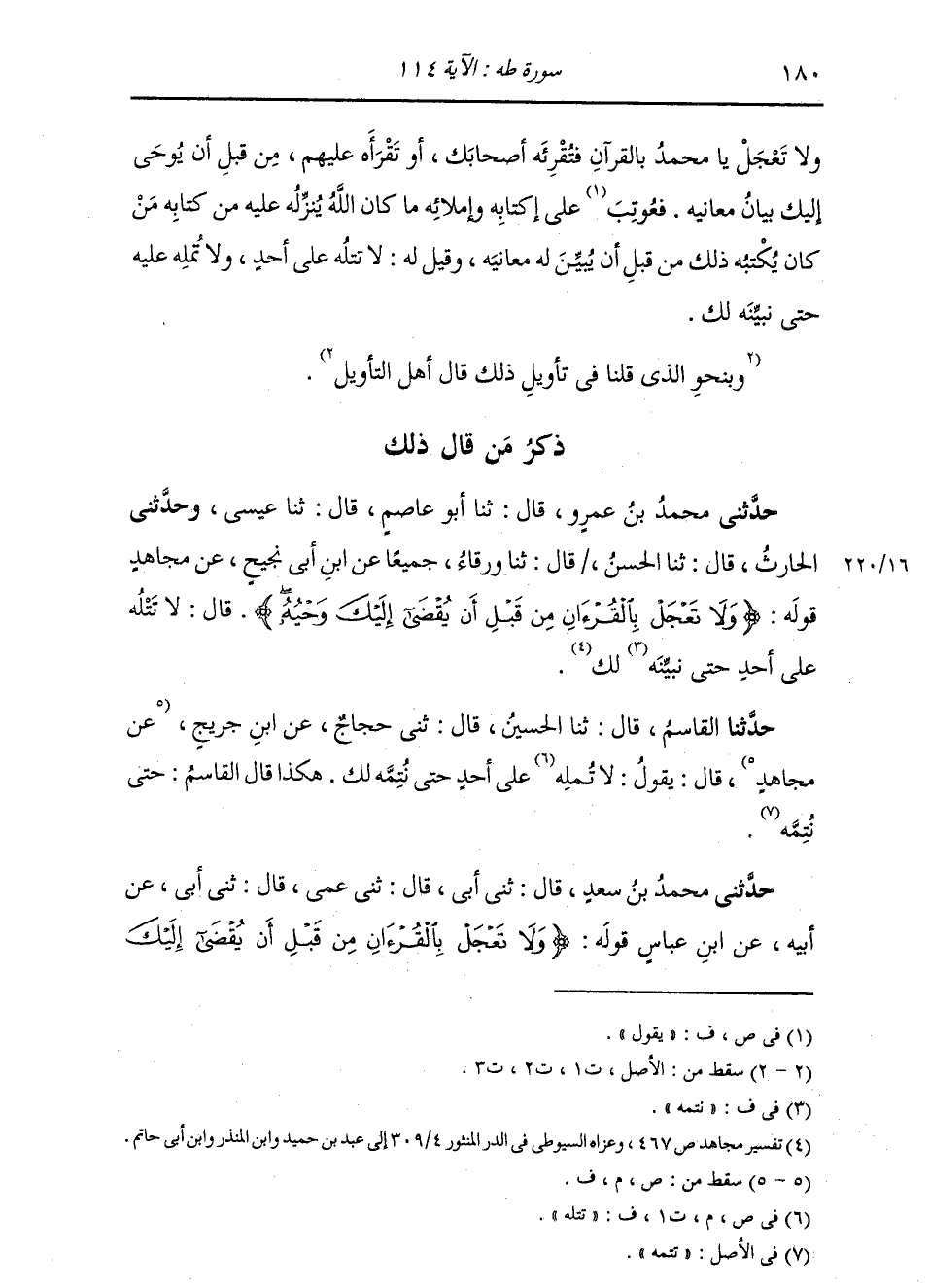 ذِكْرُ مَنْ قَالَ ذَلِكَ: حَدَّثَنِي مُحَمَّدُ بْنُ عَمْرٍو، قَالَ: ثنا أَبُو عَاصِمٍ، قَالَ: ثنا عِيسَى، وَحَدَّثَنِي الْحَارِثُ، قَالَ: ثنا الْحَسَنُ، قَالَ: ثنا وَرْقَاءُ، جَمِيعًا عَنِ ابْنِ أَبِي نَجِيحٍ، عَنْ مُجَاهِدٍ، قَوْلُهُ: {§وَلَا تَعْجَلْ بِالْقُرْآنِ مِنْ قَبْلِ أَنْ يُقْضَى إِلَيْكَ وَحْيُهُ} [طه: 114] قَالَ: لَا تَتْلُهُ عَلَى أَحَدٍ حَتَّى نُبَيِّنَهُ لَكَ
