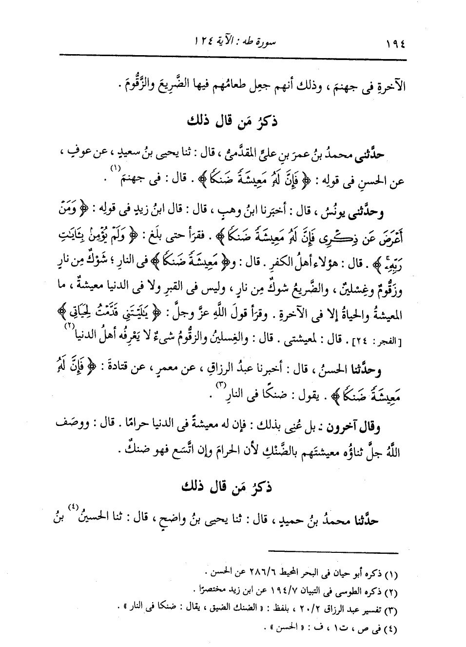 حَدَّثَنَا الْحَسَنُ، قَالَ: ثنا عَبْدُ الرَّزَّاقِ، عَنْ مَعْمَرٍ، عَنْ قَتَادَةَ، {§فَإِنَّ لَهُ مَعِيشَةً ضَنْكًا} [طه: 124] قَالَ: فِي النَّارِ وَقَالَ آخَرُونَ: بَلْ عَنَى بِذَلِكَ: فَإِنَّ لَهُ مَعِيشَةً فِي الدُّنْيَا حَرَامًا. قَالَ: وَوَصَفَ اللَّهُ جَلَّ وَعَزَّ مَعِيشَتَهُمْ بِالضَّنْكِ، لِأَنَّ الْحَرَامَ وَإِنِ اتَّسَعَ فَهُوَ ضَنْكٌ