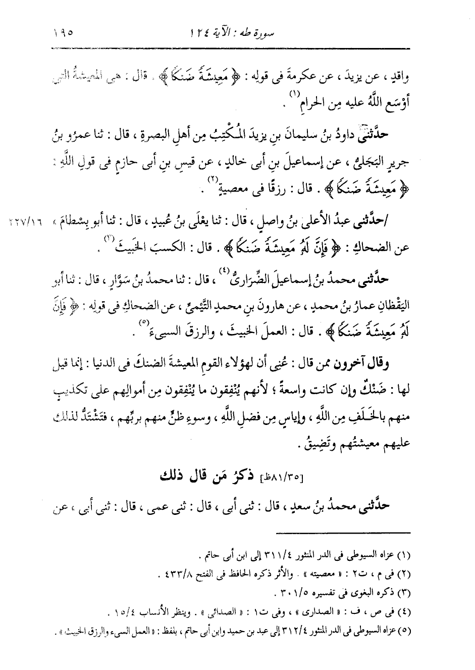 ذِكْرُ مَنْ قَالَ ذَلِكَ: حَدَّثَنِي مُحَمَّدُ بْنُ سَعْدٍ، قَالَ ثني أَبِي، قَالَ: ثني عَمِّي، قَالَ ثني أَبِي، عَنْ -[196]- أَبِيهِ، عَنِ ابْنِ عَبَّاسٍ، قَوْلُهُ: {§وَمَنْ أَعْرَضَ عَنْ ذِكْرِي، فَإِنَّ لَهُ مَعِيشَةً ضَنْكًا} [طه: 124] يَقُولُ: كُلُّ مَالٍ أَعْطَيْتُهُ عَبْدًا مِنْ عِبَادِي قَلَّ أَوْ كَثُرَ، لَا يَتَّقِينِي فِيهِ، لَا خَيْرَ فِيهِ، وَهُوَ الضَّنْكُ فِي الْمَعِيشَةِ. وَيُقَالُ: إِنَّ قَوْمًا ضُلَّالًا أَعْرَضُوا عَنِ الْحَقِّ وَكَانُوا أُولِي سَعَةٍ مِنَ الدُّنْيَا مُكْثِرِينَ، فَكَانَتْ مَعِيشَتَهُمْ ضَنْكًا، وَذَلِكَ أَنَّهُمْ كَانُوا يَرَوْنَ أَنَّ اللَّهَ عَزَّ وَجَلَّ لَيْسَ بِمُخْلِفٍ لَهُمْ مَعَايشَهُمْ مِنْ سُوءِ ظَنِّهِمْ بِاللَّهِ، وَالتَّكْذِيبِ بِهِ، فَإِذَا كَانَ الْعَبْدُ يَكْذِبُ بِاللَّهِ، وَيُسِيءُ الظَّنَّ بِهِ، اشْتَدَّتْ عَلَيْهِ مَعِيشَتَهُ، فَذَلِكَ الضَّنْكُ وَقَالَ آخَرُونَ: بَلْ عَنَى بِذَلِكَ: أَنَّ ذَلِكَ لَهُمْ فِي الْبَرْزَخِ، وَهُوَ عَذَابُ الْقَبْرِ