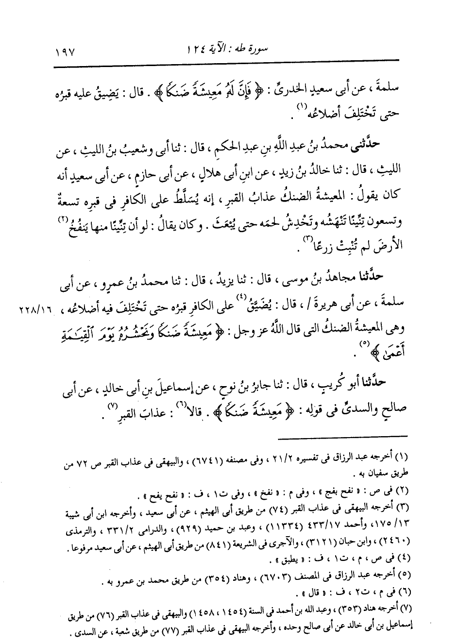 حَدَّثَنَا مُجَاهِدُ بْنُ مُوسَى، قَالَ: ثنا يَزِيدُ، قَالَ: ثنا مُحَمَّدُ بْنُ عَمْرٍو، عَنْ أَبِي سَلَمَةَ، عَنْ أَبِي هُرَيْرَةَ، قَالَ: §يُطْبَقُ عَلَى الْكَافِرِ قَبْرُهُ حَتَّى تَخْتَلِفَ فِيهِ أَضْلَاعُهُ، وَهِيَ الْمَعِيشَةُ الضَّنْكُ الَّتِي قَالَ اللَّهُ: {مَعِيشَةً ضَنْكًا وَنَحْشُرُهُ يَوْمَ الْقِيَامَةِ أَعْمَى} [طه: 124]