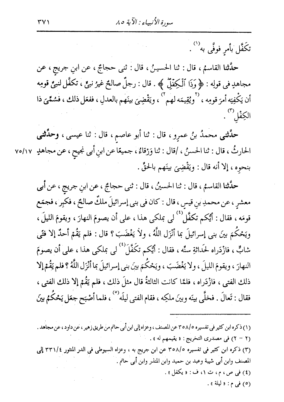 حَدَّثَنَا الْقَاسِمُ، قَالَ: ثنا الْحُسَيْنُ، قَالَ: ثني حَجَّاجٌ، عَنِ ابْنِ جُرَيْجٍ، عَنْ مُجَاهِدٍ، فِي قَوْلِهِ: {وَذَا الْكِفْلِ} [الأنبياء: 85] قَالَ " §رَجُلٌ صَالِحٌ غَيْرُ نَبِيٍّ، تَكَفَّلَ لِنَبِيِّ قَوْمِهِ أَنْ يَكْفِيَهُ أَمْرَ قَوْمِهِ , وَيُقِيمَهُ لَهُمْ , وَيَقْضِيَ بَيْنَهُمْ بِالْعَدْلِ، فَفَعَلَ ذَلِكَ، فَسُمِّيَ ذَا الْكِفْلِ حَدَّثَنِي مُحَمَّدُ بْنُ عَمْرٍو قَالَ: ثنا أَبُو عَاصِمٍ قَالَ: ثنا عِيسَى , وَحَدَّثَنِي الْحَارِثُ قَالَ: ثنا الْحَسَنُ قَالَ: ثنا وَرْقَاءُ جَمِيعًا، عَنِ ابْنِ أَبِي نَجِيحٍ، عَنْ مُجَاهِدٍ بِنَحْوِهِ، إِلَّا أَنَّهُ قَالَ: وَيَقْضِي بَيْنَهُمْ بِالْحَقِّ