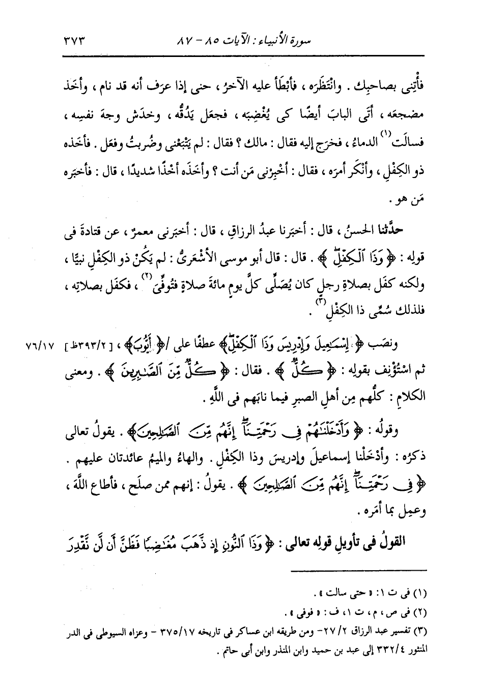 حَدَّثَنَا الْحَسَنُ قَالَ: أَخْبَرَنَا عَبْدُ الرَّزَّاقِ قَالَ: أَخْبَرَنَا مَعْمَرٌ، عَنْ قَتَادَةَ، فِي قَوْلِهِ: {وَذَا الْكِفْلِ} [الأنبياء: 85] قَالَ: قَالَ أَبُو مُوسَى الْأَشْعَرِيُّ: «§لَمْ يَكُنْ ذُو الْكِفْلِ نَبِيًّا، وَلَكِنَّهُ كَفَلَ بِصَلَاةِ رَجُلٍ كَانَ يُصَلِّي كُلَّ يَوْمٍ مِائَةَ صَلَاةٍ، فَوَفَى، فَكَفَلَ بِصَلَاتِهِ، فَلِذَلِكَ سُمِّيَ ذَا الْكِفْلِ» وَنَصَبَ إِسْمَاعِيلَ وَإِدْرِيسَ , وَذَا الْكِفْلِ، عَطْفًا عَلَى أَيُّوبَ، ثُمَّ اسْتُؤْنِفَ بِقَوْلِهِ: {كُلٌّ} [الأنبياء: 85] فَقَالَ: {كُلٌّ مِنَ الصَّابِرِينَ} [الأنبياء: 85] وَمَعْنَى الْكَلَامِ: كُلُّهُمْ مِنْ أَهْلِ الصَّبْرِ فِيمَا نَابَهُمْ فِي اللَّهِ