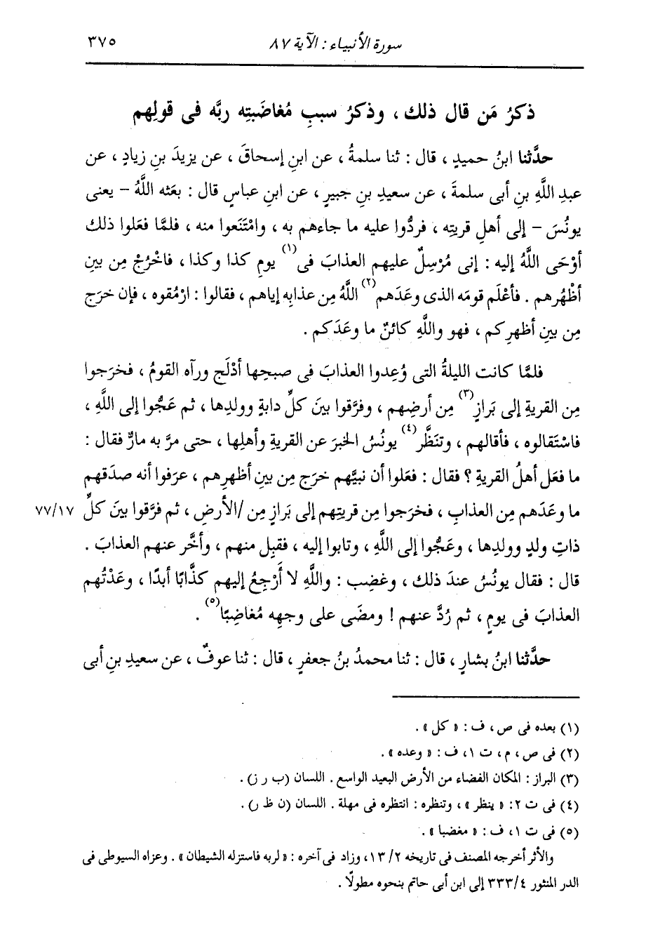 ذِكْرُ مَنْ قَالَ ذَلِكَ , وَذِكْرُ سَبَبِ مُغَاضَبَتِهِ رَبَّهُ فِي قَوْلِهِمْ: حَدَّثَنَا ابْنُ حُمَيْدٍ، قَالَ: ثنا سَلَمَةُ، عَنِ ابْنِ إِسْحَاقَ، عَنْ يَزِيدَ بْنِ زِيَادٍ، عَنْ عَبْدِ اللَّهِ بْنِ أَبِي سَلَمَةَ، عَنْ سَعِيدِ بْنِ جُبَيْرٍ، عَنِ ابْنِ عَبَّاسٍ، قَالَ: " §بَعَثَهُ اللَّهُ يَعْنِي يُونُسَ إِلَى أَهْلِ قَرْيَتِهِ، فَرَدُّوا عَلَيْهِ مَا جَاءَهُمْ بِهِ , وَامْتَنَعُوا مِنْهُ. فَلَمَّا فَعَلُوا ذَلِكَ أَوْحَى اللَّهُ إِلَيْهِ: إِنِّي مُرْسَلٌ عَلَيْهِمُ الْعَذَابَ فِي يَوْمِ كَذَا وَكَذَا، فَاخْرُجْ مِنْ بَيْنِ أَظْهُرِهِمْ فَأَعْلَمَ قَوْمَهُ الَّذِي وَعْدَهُ اللَّهُ مِنْ عَذَابِهِ إِيَّاهُمْ، فَقَالُوا: ارْمُقُوهُ، فَإِنْ خَرَجَ مِنْ بَيْنِ أَظْهُرِكُمْ فَهُوَ وَاللَّهِ كَائِنٌ مَا وَعَدَكُمْ. فَلَمَّا كَانَتِ اللَّيْلَةُ الَّتِي وُعِدُوا بِالْعَذَابِ فِي صُبْحِهَا أَدْلَجَ وَرَآهُ الْقَوْمُ، فَخَرَجُوا مِنَ الْقَرْيَةِ إِلَى بَرَازٍ مِنْ أَرْضِهِمْ، وَفَرَّقُوا بَيْنَ كُلِّ دَابَّةٍ وَوَلَدِهَا، ثُمَّ عَجُّوا إِلَى اللَّهِ، فَاسْتَقَالُوهُ، فَأَقَالَهُمْ، وَتَنَظَّرَ يُونُسُ الْخَبَرَ عَنِ الْقَرْيَةِ وَأَهْلِهَا، حَتَّى مَرَّ بِهِ مَارٌّ، فَقَالَ: مَا فَعَلَ أَهْلُ الْقَرْيَةِ؟ فَقَالَ: فَعَلُوا أَنَّ نَبِيَّهُمْ خَرَجَ مِنْ بَيْنِ أَظْهُرِهِمْ، عَرَفُوا أَنَّهُ صَدَقَهُمْ مَا وَعَدَهُمْ مِنَ الْعَذَابِ، فَخَرَجُوا مِنْ قَرْيَتِهِمْ إِلَى بَرَازٍ مِنَ الْأَرْضِ، ثُمَّ فَرَّقُوا بَيْنَ كُلِّ ذَاتِ وَلَدٍ وَوَلَدِهَا. وَعَجُّوا إِلَى اللَّهِ , وَتَابُوا إِلَيْهِ. فَقَبِلَ مِنْهُمْ، وَأَخَّرَ عَنْهُمُ الْعَذَابَ قَالَ: فَقَالَ يُونُسُ عِنْدَ ذَلِكَ وَغَضِبَ: وَاللَّهِ لَا أَرْجِعُ إِلَيْهِمْ كَذَّابًا أَبَدًا، وَعَدْتُهُمُ الْعَذَابَ فِي يَوْمٍ , ثُمَّ رُدَّ عَنْهُمْ وَمَضَى عَلَى وَجْهِهِ مُغَاضِبًا "