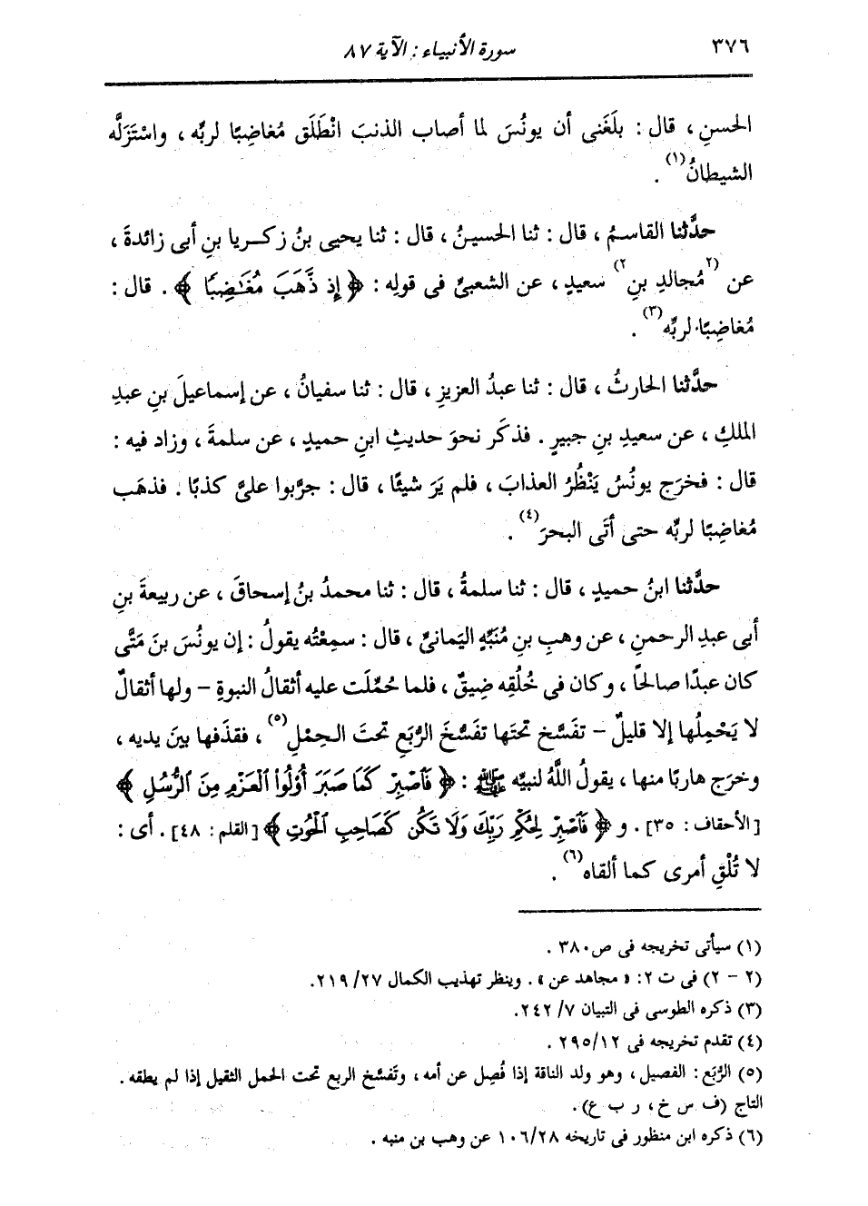 حَدَّثَنَا الْقَاسِمُ، قَالَ: ثنا الْحُسَيْنُ، قَالَ: ثنا يَحْيَى بْنُ زَكَرِيَّا بْنِ أَبِي زَائِدَةَ، عَنْ مُجَالِدِ بْنِ سَعِيدٍ، عَنِ الشَّعْبِيِّ، فِي قَوْلِهِ: {إِذْ ذَهَبَ مُغَاضِبًا} [الأنبياء: 87] قَالَ: «§مُغَاضِبًا لِرَبِّهِ»