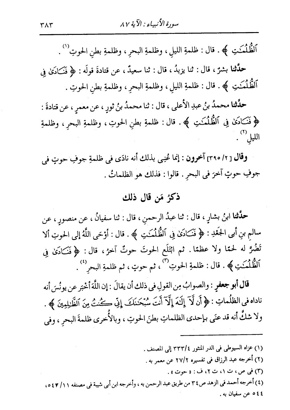 ذِكْرُ مَنْ قَالَ ذَلِكَ: حَدَّثَنَا ابْنُ بَشَّارٍ، قَالَ: ثنا عَبْدُ الرَّحْمَنِ، قَالَ: ثنا سُفْيَانُ، عَنْ مَنْصُورٍ، عَنْ سَالِمِ بْنِ أَبِي الْجَعْدِ: {فَنَادَى فِي الظُّلُمَاتِ} [الأنبياء: 87] قَالَ: " §أَوْحَى اللَّهُ إِلَى الْحُوتِ أَنْ لَا تَضُرَّ لَهُ لَحْمًا وَلَا عَظْمًا. ثُمَّ ابْتَلَعَ الْحُوتَ حُوتٌ آخَرُ , قَالَ: {فَنَادَى فِي الظُّلُمَاتِ} [الأنبياء: 87] قَالَ: ظُلْمَةُ الْحُوتِ، ثُمَّ حُوتٌ، ثُمَّ ظُلْمَةُ الْبَحْرِ " قَالَ أَبُو جَعْفَرٍ: وَالصَّوَابُ مِنَ الْقَوْلِ فِي ذَلِكَ أَنْ يُقَالَ: إِنَّ اللَّهَ أَخْبَرَ عَنْ يُونُسَ أَنَّهُ نَادَاهُ فِي الظُّلُمَاتِ: {أَنْ لَا إِلَهَ إِلَّا أَنْتَ سُبْحَانَكَ إِنِّي كُنْتُ مِنَ الظَّالِمِينَ} [الأنبياء: 87] وَلَا شَكَّ أَنَّهُ قَدْ عَنَى بِإِحْدَى الظُّلُمَاتِ: بَطْنَ الْحُوتِ، وَبِالْأُخْرَى: ظُلْمَةَ الْبَحْرِ، وَفِي -[384]- الثَّالِثَةِ اخْتِلَافٌ، وَجَائِزٌ أَنْ تَكُونَ تِلْكَ الثَّالِثَةُ ظُلْمَةَ اللَّيْلِ، وَجَائِزٌ أَنْ تَكُونَ كَوْنَ الْحُوتِ فِي جَوْفِ حُوتٍ آخَرَ. وَلَا دَلِيلَ يَدُلُّ عَلَى أَيِّ ذَلِكَ مِنْ أَيٍّ، فَلَا قَوْلَ فِي ذَلِكَ أَوْلَى بِالْحَقِّ مِنَ التَّسْلِيمِ لِظَاهِرِ التَّنْزِيلِ. وَقَوْلُهُ: {لَا إِلَهَ إِلَّا أَنْتَ سُبْحَانَكَ} [الأنبياء: 87] يَقُولُ: نَادَى يُونُسُ بِهَذَا الْقَوْلِ مُعْتَرِفًا بِذَنْبِهِ , تَائِبًا مِنْ خَطِيئَتِهِ {إِنِّي كُنْتُ مِنَ الظَّالِمِينَ} [الأنبياء: 87] فِي مَعْصِيَتِي إِيَّاكَ