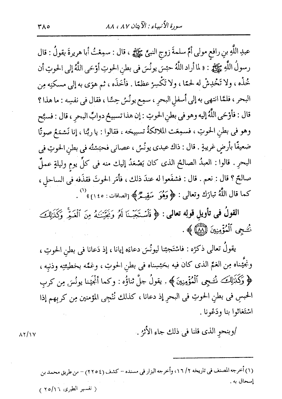 §الْقَوْلُ فِي تَأْوِيلِ قَوْلِهِ تَعَالَى: {فَاسْتَجَبْنَا لَهُ وَنَجَّيْنَاهُ مِنَ الْغَمِّ وَكَذَلِكَ نُنْجِي الْمُؤْمِنِينَ} [الأنبياء: 88] يَقُولُ تَعَالَى ذِكْرُهُ: {فَاسَتَجَبْنَا} [الأنبياء: 76] لِيُونُسَ دُعَاءَهُ إِيَّانَا، إِذْ دَعَانَا فِي بَطْنِ الْحُوتِ، وَنَجَّيْنَاهُ مِنَ الْغَمِّ الَّذِي كَانَ فِيهِ بِحَبْسِنَاهُ فِي بَطْنِ الْحُوتِ , وَغَمِّهِ بِخَطِيئَتِهِ وَذَنْبِهِ. {وَكَذَلِكَ نُنْجِي الْمُؤْمِنِينَ} [الأنبياء: 88] يَقُولُ جَلَّ ثَنَاؤُهُ: وَكَمَا أَنْجَيْنَا يُونُسَ مِنْ كَرْبِ الْحَبْسِ فِي بَطْنِ الْحُوتِ فِي الْبَحْرِ إِذْ دَعَانَا، كَذَلِكَ نُنْجِي الْمُؤْمِنِينَ مِنْ كَرْبِهِمْ إِذَا اسْتَغَاثُوا بِنَا وَدَعَوْنَا. وَبِنَحْوِ الَّذِي قُلْنَا فِي ذَلِكَ جَاءَ الْأَثَرُ