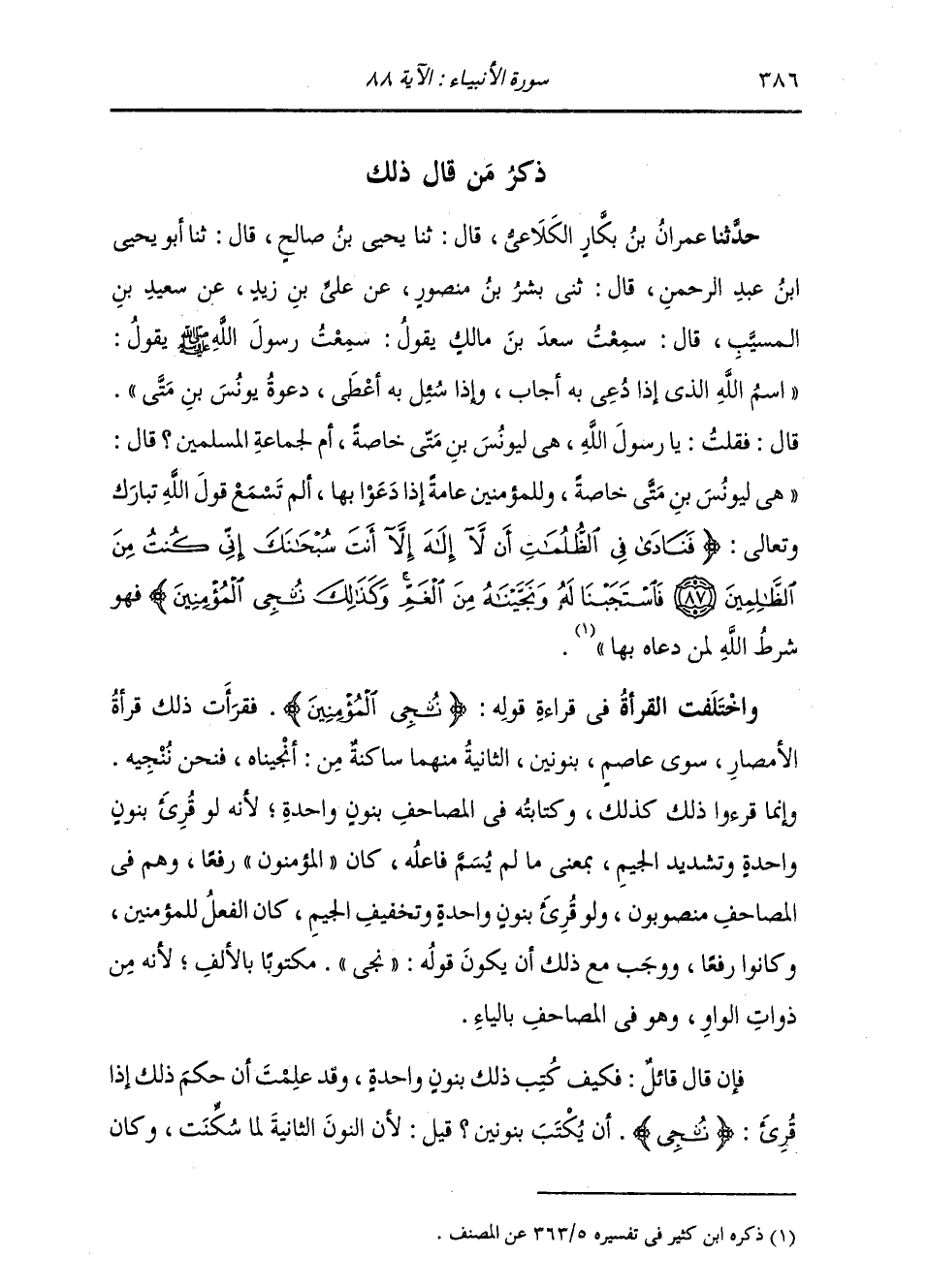 ذِكْرُ مَنْ قَالَ ذَلِكَ: حَدَّثَنَا عِمْرَانُ بْنُ بَكَّارٍ الْكَلَاعِيُّ، قَالَ: ثنا يَحْيَى بْنُ عَبْدِ الرَّحْمَنِ، قَالَ: ثنا أَبُو يَحْيَى بْنُ عَبْدِ الرَّحْمَنِ، قَالَ: ثني بِشْرُ بْنُ مَنْصُورٍ، عَنْ عَلِيِّ بْنِ زَيْدٍ، عَنْ سَعِيدِ بْنِ الْمُسَيِّبِ، قَالَ: سَمِعْتُ سَعْدَ بْنَ مَالِكٍ، يَقُولُ: سَمِعْتُ رَسُولَ اللَّهِ صَلَّى اللهُ عَلَيْهِ وَسَلَّمَ يَقُولُ: «§اسْمُ اللَّهِ الَّذِي إِذَا دُعِيَ بِهِ أَجَابَ , وَإِذَا سُئِلَ بِهِ أَعْطَى، دَعْوَةُ يُونُسَ بْنِ مَتَّى» . قَالَ: فَقُلْتُ: يَا رَسُولَ اللَّهِ، هِيَ لِيُونُسَ بْنِ مَتَّى خَاصَّةٌ , أَمْ لِجَمَاعَةِ الْمُسْلِمِينَ؟ قَالَ: " هِيَ لِيُونُسَ بْنِ مَتَّى خَاصَّةٌ، وَلِلْمُؤْمِنِينَ عَامَّةٌ , إِذَا دَعَوْا بِهَا , أَلَمْ تَسْمَعْ قَوْلَ اللَّهِ تَبَارَكَ وَتَعَالَى {فَنَادَى فِي الظُّلُمَاتِ أَنْ لَا إِلَهَ إِلَّا أَنْتَ سُبْحَانَكَ إِنِّي كُنْتُ مِنَ الظَّالِمِينَ فَاسْتَجَبْنَا لَهُ وَنَجَّيْنَاهُ مِنَ الْغَمِّ وَكَذَلِكَ نُنْجِي الْمُؤْمِنِينَ} [الأنبياء: 88] ؟ فَهُوَ شَرْطُ اللَّهِ لِمَنْ دَعَاهُ بِهَا " وَاخْتَلَفَتِ الْقُرَّاءُ فِي قِرَاءَةِ قَوْلِهِ: {نُنْجِي الْمُؤْمِنِينَ} [الأنبياء: 88] فَقَرَأَتْ ذَلِكَ قُرَّاءُ الْأَمْصَارِ، سِوَى عَاصِمٍ، بِنُونَيْنِ , الثَّانِيَةُ مِنْهُمَا سَاكِنَةٌ، مِنْ أَنْجَيْنَاهُ، فَنَحْنُ نُنْجِيهِ. وَإِنَّمَا قَرَءُوا ذَلِكَ كَذَلِكَ , وَكِتَابَتُهُ فِي الْمَصَاحِفِ بَنُونٍ وَاحِدَةٍ، لِأَنَّهُ لَوْ قُرِئَ بَنُونٍ وَاحِدَةٍ , وَتَشْدِيدِ الْجِيمِ، بِمَعْنَى مَا لَمْ يُسَمَّ فَاعِلُهُ، كَانَ الْمُؤْمِنُونَ رَفْعًا، وَهُمْ فِي الْمَصَاحِفِ مَنْصُوبُونَ، وَلَوْ قُرِئَ بَنُونٍ وَاحِدَةٍ , وَتَخْفِيفِ الْجِيمِ، كَانَ الْفِعْلُ لِلْمُؤْمِنِينَ , وَكَانُوا رَفْعًا، وَوَجَبَ مَعَ ذَلِكَ أَنْ يَكُونَ قَوْلُهُ (نُجِّيَ) مَكْتُوبًا بِالْأَلِفِ، لِأَنَّهُ مِنْ ذَوَاتِ الْوَاوِ، وَهُوَ فِي الْمَصَاحِفِ بِالْيَاءِ. فَإِنْ قَالَ قَائِلٌ: فَكَيْفَ كُتِبَ ذَلِكَ بَنُونٍ وَاحِدٍ، وَقَدْ عَلِمْتَ أَنَّ حُكْمَ ذَلِكَ إِذَا قُرِئَ: {نُنْجِي} [يونس: 103] أَنْ يُكْتَبَ بِنُونَيْنِ؟ قِيلَ: لِأَنَّ النُّونَ الثَّانِيَةَ لَمَّا سُكِّنَتْ وَكَانَ