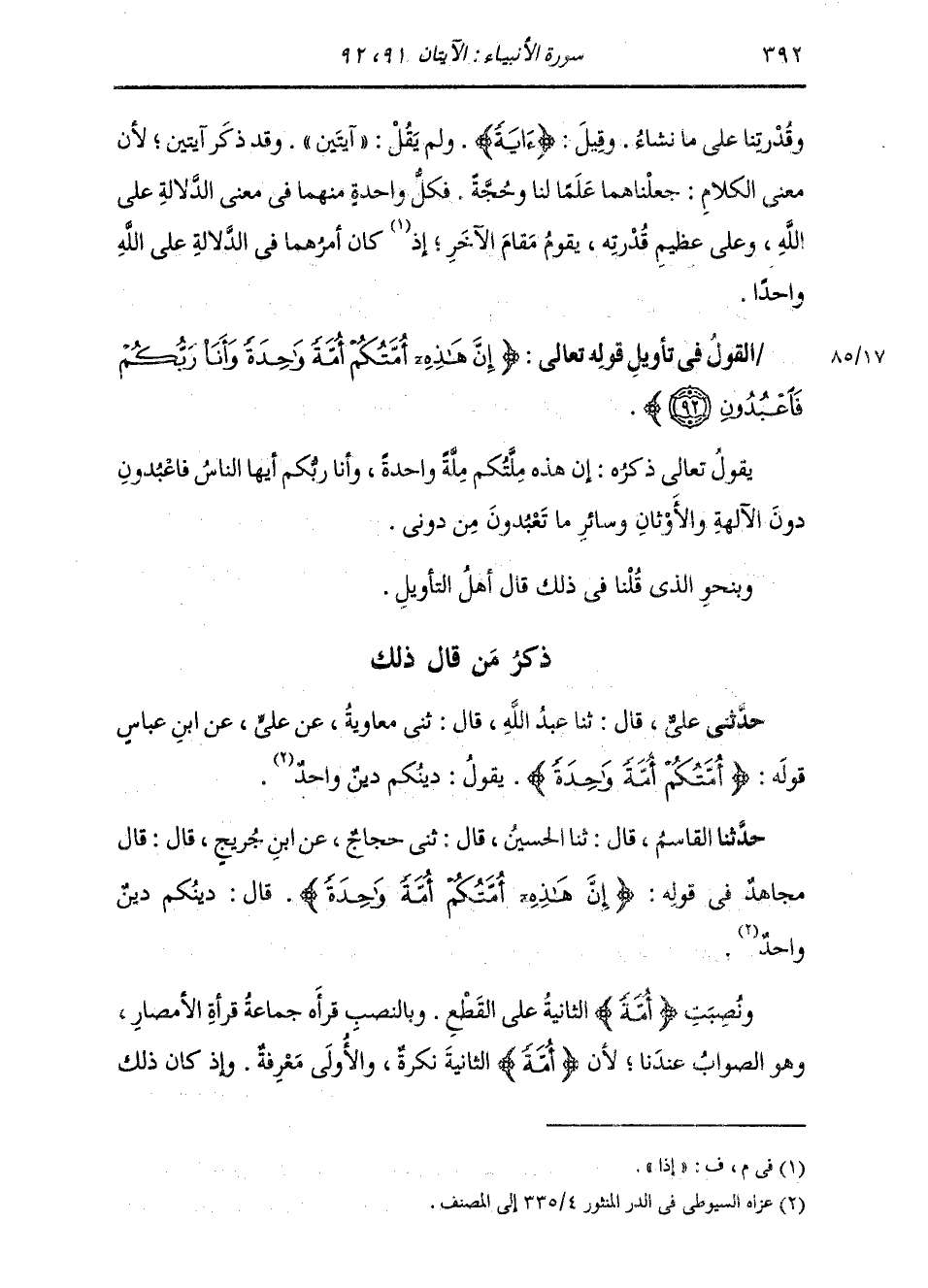 §الْقَوْلُ فِي تَأْوِيلِ قَوْلِهِ تَعَالَى: {إِنَّ هَذِهِ أُمَّتُكُمْ أُمَّةً وَاحِدَةً وَأَنَا رَبُّكُمْ فَاعْبُدُونِ} [الأنبياء: 92] يَقُولُ تَعَالَى ذِكْرُهُ: إِنَّ هَذِهِ مِلَّتُكُمْ مِلَّةً وَاحِدَةً، وَأَنَا رَبُّكُمْ أَيُّهَا النَّاسُ فَاعْبُدُونِ دُونَ الْآلِهَةِ وَالْأَوْثَانِ وَسَائِرِ مَا تَعْبُدُونَ مِنْ دُونِي وَبِنَحْوِ الَّذِي قُلْنَا فِي ذَلِكَ قَالَ أَهْلُ التَّأْوِيلِ