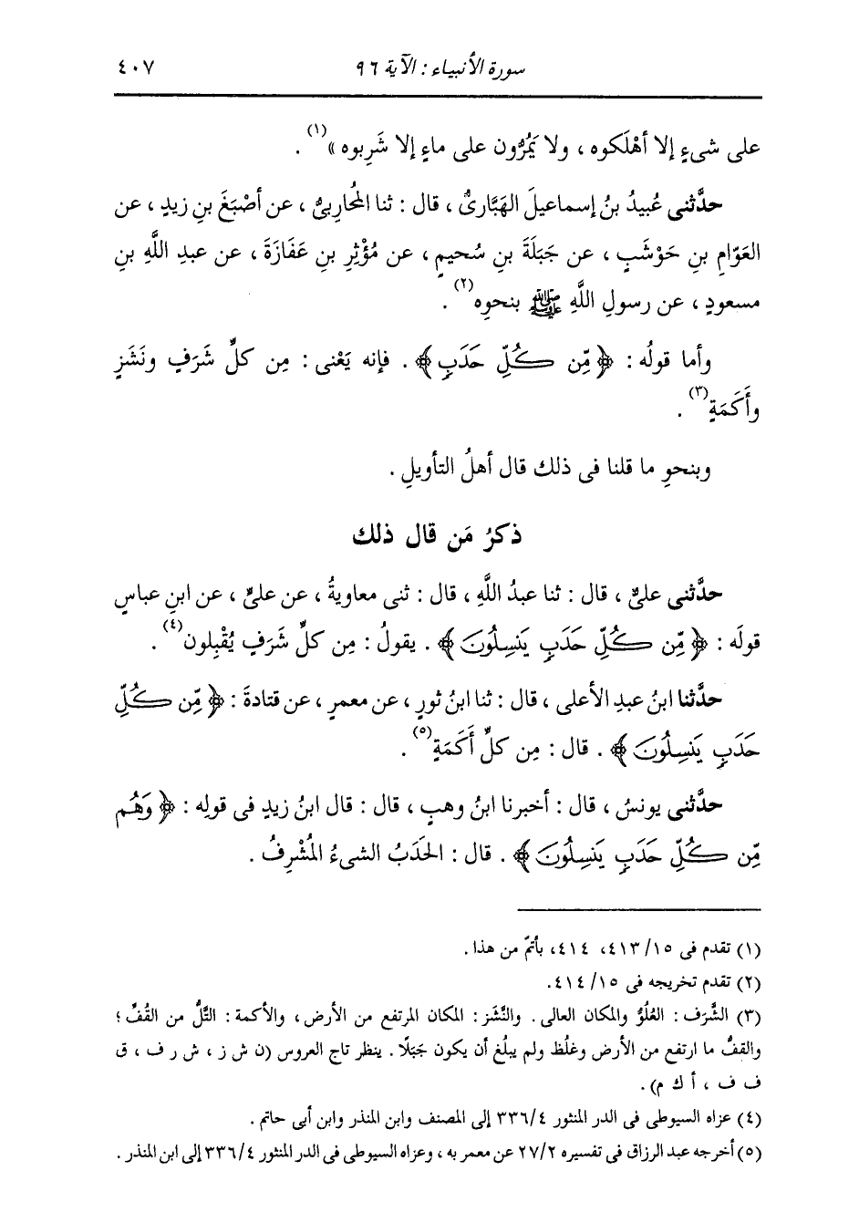 ذِكْرُ مَنْ قَالَ ذَلِكَ: حَدَّثَنِي عَلِيُّ، قَالَ: ثنا عَبْدُ اللَّهِ، قَالَ: ثني مُعَاوِيَةُ، عَنْ عَلِيٍّ، عَنِ ابْنِ عَبَّاسٍ، قَوْلُهُ: {مِنْ كُلِّ حَدَبٍ يَنْسِلُونَ} [الأنبياء: 96] يَقُولُ: «§مِنْ كُلِّ شَرَفٍ يُقْبِلُونَ»