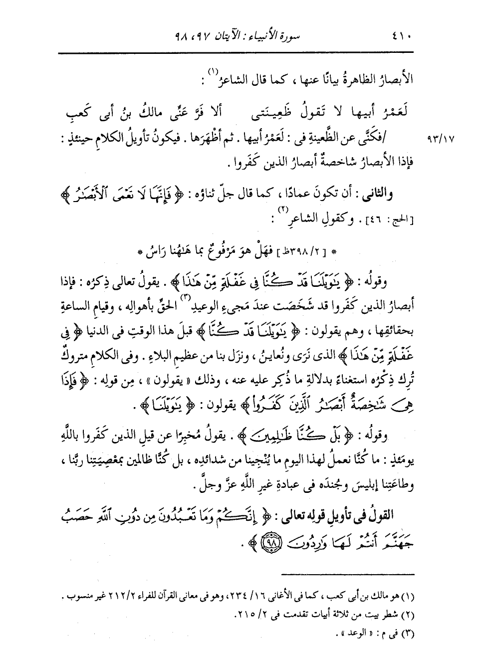 §الْقَوْلُ فِي تَأْوِيلِ قَوْلِهِ تَعَالَى: {إِنَّكُمْ وَمَا تَعْبُدُونَ مِنْ دُونِ اللَّهِ حَصَبُ جَهَنَّمَ أَنتُمْ لَهَا وَارِدُونَ} [الأنبياء: 98]-[411]- يَقُولُ تَعَالَى ذِكْرُهُ: إِنَّكُمْ أَيُّهَا الْمُشْرِكُونَ بِاللَّهِ، الْعَابِدُونَ مِنْ دُونِهِ الْأَوْثَانَ وَالْأَصْنَامَ، وَمَا تَعْبُدُونَ مِنْ دُونِ اللَّهِ مِنَ الْآلِهَةِ. كَمَا: