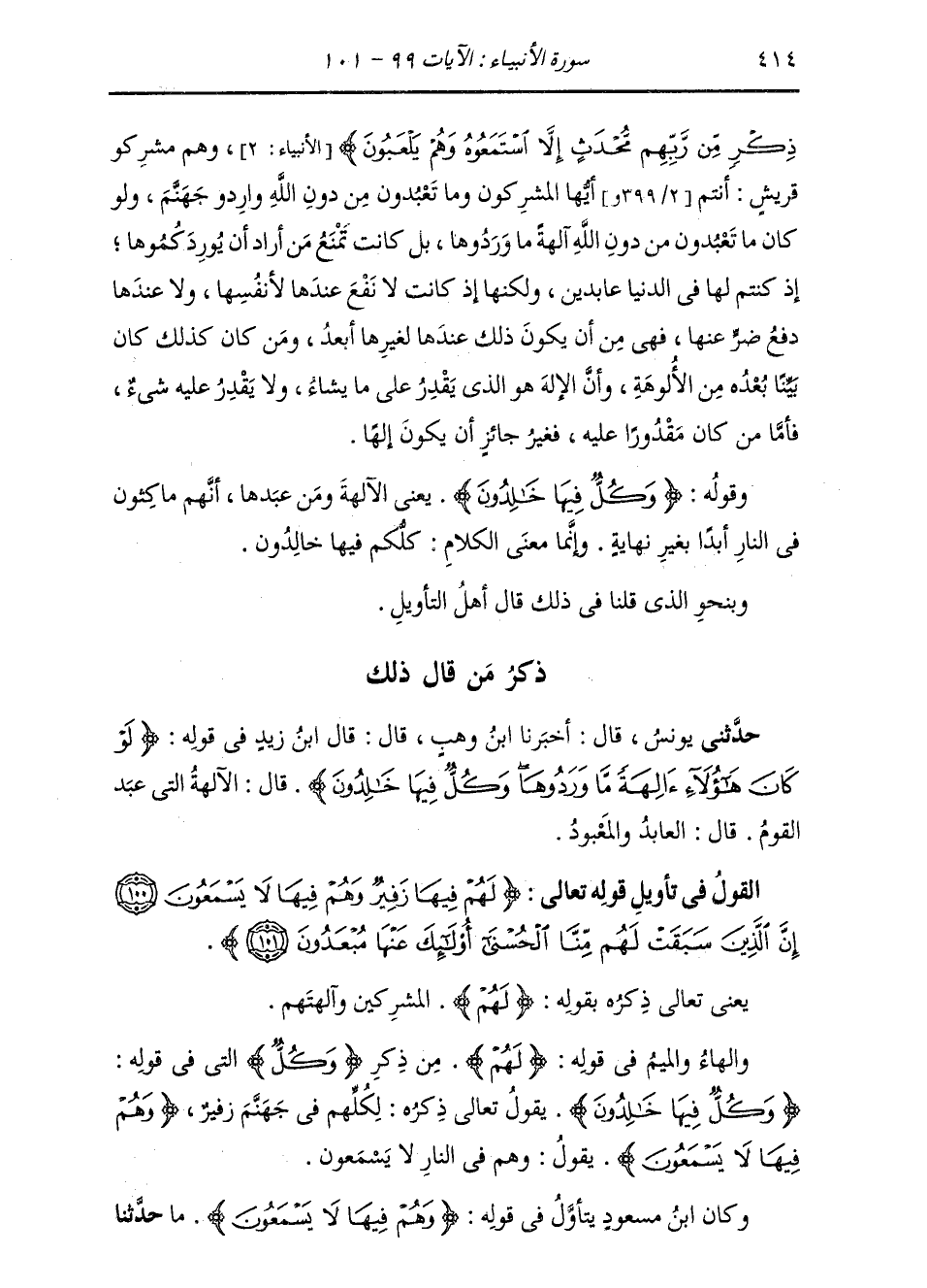 ذِكْرُ مَنْ قَالَ ذَلِكَ: حَدَّثَنِي يُونُسُ، قَالَ: أَخْبَرَنَا ابْنُ وَهْبٍ، قَالَ: قَالَ ابْنُ زَيْدٍ، فِي قَوْلِهِ: {لَوْ كَانَ هَؤُلَاءِ آلِهَةً مَا وَرَدُوهَا وَكُلٌّ فِيهَا خَالِدُونَ} [الأنبياء: 99] قَالَ: " §الْآلِهَةُ الَّتِي عَبَدَ الْقَوْمُ قَالَ: الْعَابِدُ وَالْمَعْبُودُ