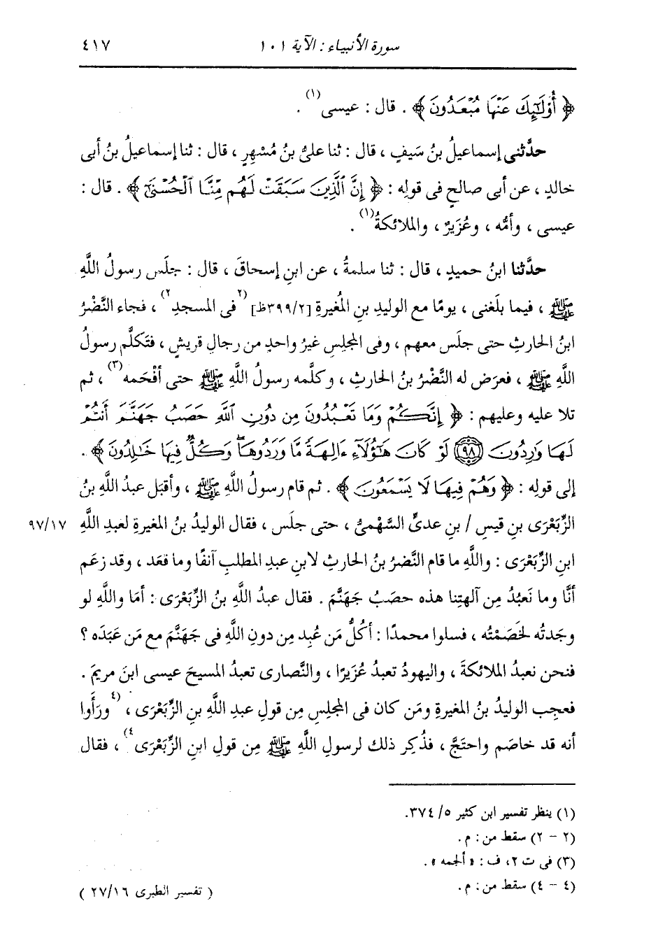 حَدَّثَنَا ابْنُ حُمَيْدٍ، قَالَ: ثنا سَلَمَةُ، عَنِ ابْنِ إِسْحَاقَ، قَالَ: " §جَلَسَ رَسُولُ اللَّهِ صَلَّى اللهُ عَلَيْهِ وَسَلَّمَ فِيمَا بَلَغَنِي يَوْمًا مَعَ الْوَلِيدِ بْنِ الْمُغِيرَةِ، فَجَاءَ النَّضْرُ بْنُ الْحَارِثِ حَتَّى جَلَسَ مَعَهُمْ , وَفِي الْمَجْلِسِ غَيْرُ وَاحِدٍ مِنْ رِجَالِ قُرَيْشٍ، فَتَكَلَّمَ رَسُولُ اللَّهِ صَلَّى اللهُ عَلَيْهِ وَسَلَّمَ، فَعَرَضَ لَهُ النَّضْرُ بْنُ الْحَارِثِ، وَكَلَّمَهُ رَسُولُ اللَّهِ صَلَّى اللهُ عَلَيْهِ وَسَلَّمَ حَتَّى أَفْحَمَهُ، ثُمَّ تَلَا عَلَيْهِ وَعَلَيْهِمْ: {إِنَّكُمْ وَمَا تَعْبُدُونَ مِنْ دُونِ اللَّهِ حَصَبُ جَهَنَّمَ أَنْتُمْ لَهَا وَارِدُونَ لَوْ كَانَ هَؤُلَاءِ آلِهَةً مَا وَرَدُوهَا وَكُلٌّ فِيهَا خَالِدُونَ} [الأنبياء: 99] إِلَى قَوْلِهِ: {وَهُمْ فِيهَا لَا يَسْمَعُونَ} [الأنبياء: 100] . ثُمَّ قَامَ رَسُولُ اللَّهِ صَلَّى اللهُ عَلَيْهِ وَسَلَّمَ، وَأَقْبَلَ عَبْدُ اللَّهِ بْنُ الزَّبْعَرِيِّ بْنِ قَيْسِ بْنِ عَدِيٍّ السَّهْمِيُّ حَتَّى جَلَسَ، فَقَالَ الْوَلِيدُ بْنُ الْمُغِيرَةِ لِعَبْدِ اللَّهِ بْنِ الزَّبْعَرِيِّ: وَاللَّهِ مَا قَامَ النَّضْرُ بْنُ الْحَارِثِ لِابْنِ عَبْدِ الْمُطَّلِبِ آنِفًا وَمَا قَعَدَ وَقَدْ زَعَمَ أَنَّا وَمَا نَعْبُدُ مِنْ آلِهَتِنَا هَذِهِ حَصَبُ جَهَنَّمَ , فَقَالَ عَبْدُ اللَّهِ بْنُ الزَّبْعَرِيُّ: أَمَا وَاللَّهِ لَوْ وَجَدْتُهُ لَخَصَمْتُهُ , فَسَلُوا مُحَمَّدًا: أَكُلُّ مَنْ عُبِدَ مِنْ دُونِ اللَّهِ فِي جَهَنَّمَ مَعَ مَنْ عَبَدَهُ؟ فَنَحْنُ نَعْبُدُ الْمَلَائِكَةَ، وَالْيَهُودُ تَعْبُدُ عُزَيْرًا، وَالنَّصَارَى تَعْبُدُ الْمَسِيحَ عِيسَى ابْنَ مَرْيَمَ. فَعَجِبَ الْوَلِيدُ بْنُ الْمُغِيرَةِ وَمَنْ كَانَ فِي الْمَجْلِسِ مِنْ قَوْلِ عَبْدِ اللَّهِ بْنِ الزَّبْعَرِيِّ، وَرَأَوْا أَنَّهُ قَدِ احْتَجَّ وَخَاصَمَ. فَذُكِرَ ذَلِكَ لِرَسُولِ اللَّهِ صَلَّى اللهُ عَلَيْهِ وَسَلَّمَ مِنْ قَوْلِ ابْنِ الزَّبْعَرِيِّ، فَقَالَ:
