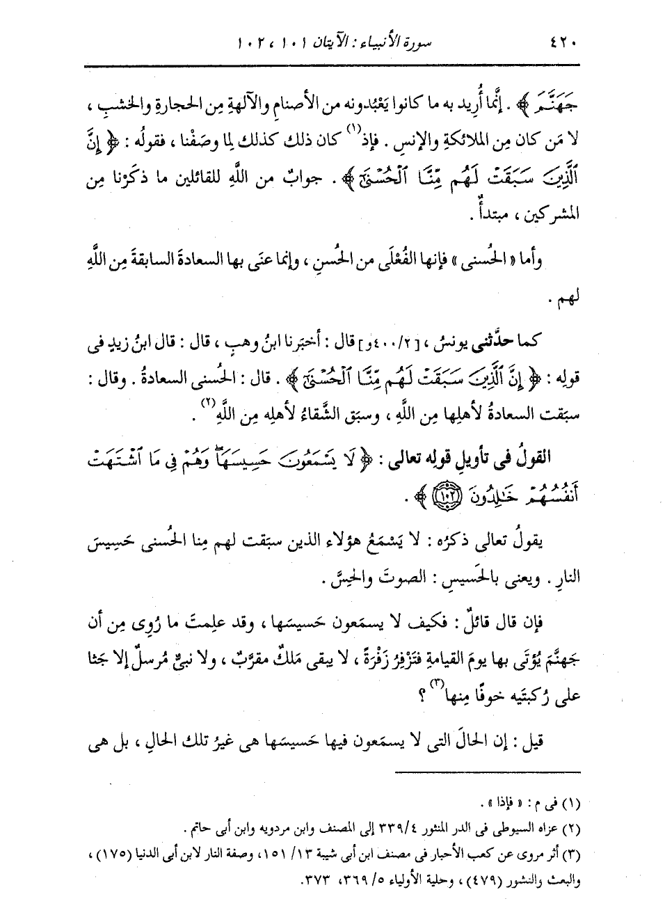§الْقَوْلُ فِي تَأْوِيلِ قَوْلِهِ تَعَالَى: {لَا يَسْمَعُونَ حَسِيسَهَا وَهُمْ فِي مَا اشْتَهَتْ أَنفُسُهُمْ خَالِدُونَ} [الأنبياء: 102] يَقُولُ تَعَالَى ذِكْرُهُ: لَا يَسْمَعُ هَؤُلَاءِ الَّذِينَ سَبَقَتْ لَهُمْ مِنَّا الْحُسْنَى حَسِيسَ النَّارِ، وَيَعْنِي بِالْحَسِيسِ: الصَّوْتَ وَالْحِسَّ. فَإِنْ قَالَ قَائِلٌ: فَكَيْفَ لَا يَسْمَعُونَ حَسِيسَهَا، وَقَدْ عَلِمْتَ مَا رُوِيَ مِنْ أَنَّ جَهَنَّمَ يُؤْتَى بِهَا يَوْمَ الْقِيَامَةِ فَتَزْفُرُ زَفْرَةً لَا يَبْقَى مَلَكٌ مُقَرَّبٌ , وَلَا نَبِيُّ مُرْسَلٌ إِلَّا جَثَا عَلَى رُكْبَتَيْهِ خَوْفًا مِنْهَا , قِيلَ: إِنَّ الْحَالَ الَّتِي لَا يَسْمَعُونَ فِيهَا حَسِيسَهَا هِيَ غَيْرُ تِلْكَ الْحَالِ، بَلْ هِيَ -[421]- الْحَالُ الَّتِي: