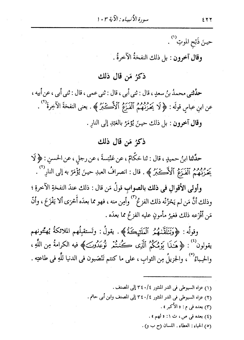 ذِكْرُ مَنْ قَالَ ذَلِكَ: حَدَّثَنِي مُحَمَّدُ بْنُ سَعْدٍ، قَالَ: ثني أَبِي قَالَ: ثني عَمِّي قَالَ: ثني أَبِي، عَنْ أَبِيهِ، عَنِ ابْنِ عَبَّاسٍ، قَوْلُهُ: {لَا يَحْزُنُهُمُ الْفَزَعُ الْأَكْبَرُ} [الأنبياء: 103] «§يَعْنِي النَّفْخَةَ الْآخِرَةَ» وَقَالَ آخَرُونَ: بَلْ ذَلِكَ حِينَ يُؤْمَرُ بِالْعَبْدِ إِلَى النَّارِ