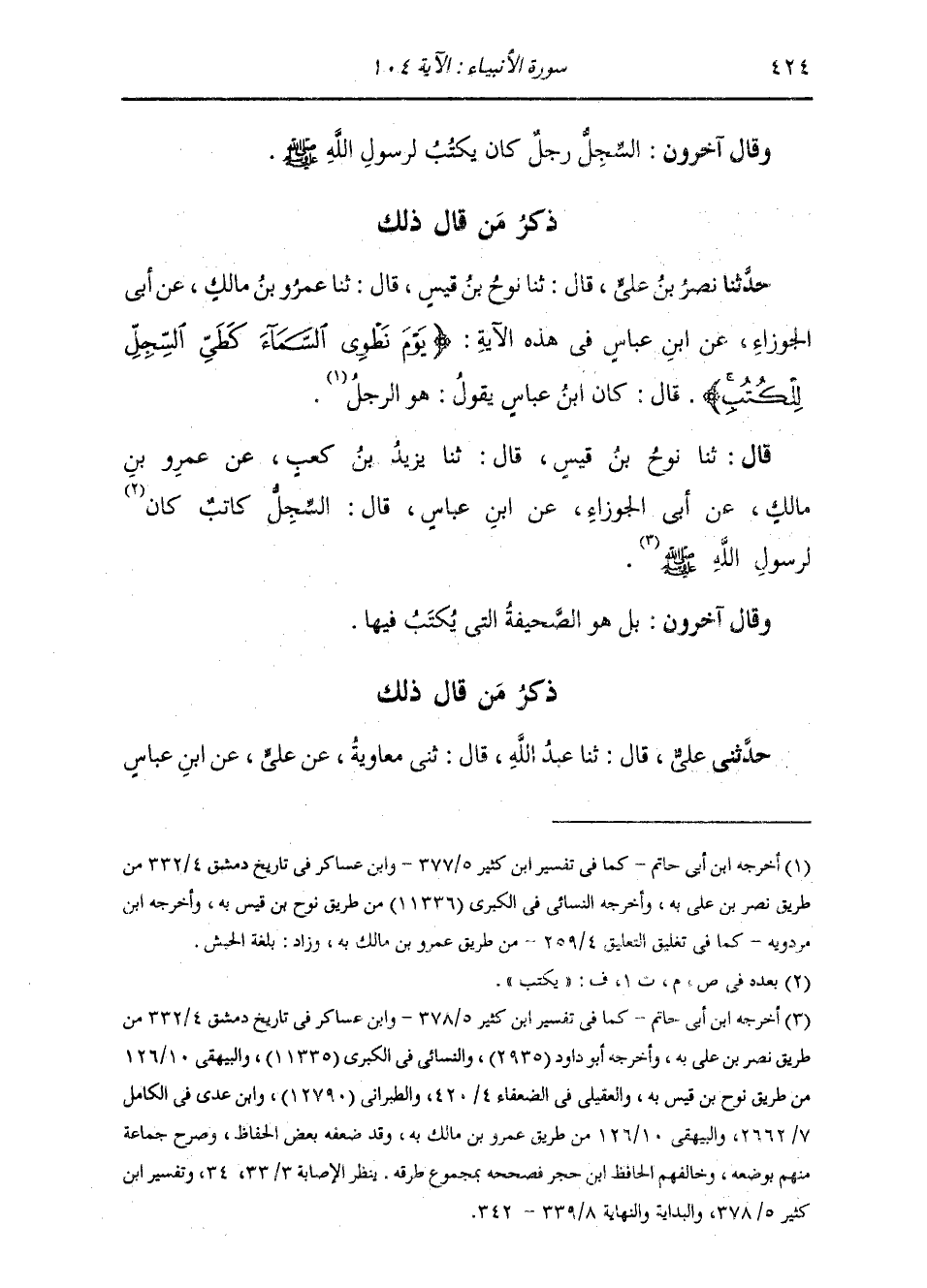 قَالَ: ثنا نُوحُ بْنُ قَيْسٍ قَالَ: ثنا يَزِيدُ بْنُ كَعْبٍ، عَنْ عَمْرِو بْنِ مَالِكٍ، عَنْ أَبِي الْجَوْزَاءِ، عَنِ ابْنِ عَبَّاسٍ قَالَ: " §السِّجِلُّ: كَاتِبٌ كَانَ يَكْتُبُ لِرَسُولِ اللَّهِ صَلَّى اللهُ عَلَيْهِ وَسَلَّمَ " وَقَالَ آخَرُونَ: بَلْ هُوَ الصَّحِيفَةُ الَّتِي يُكْتَبُ فِيهَا