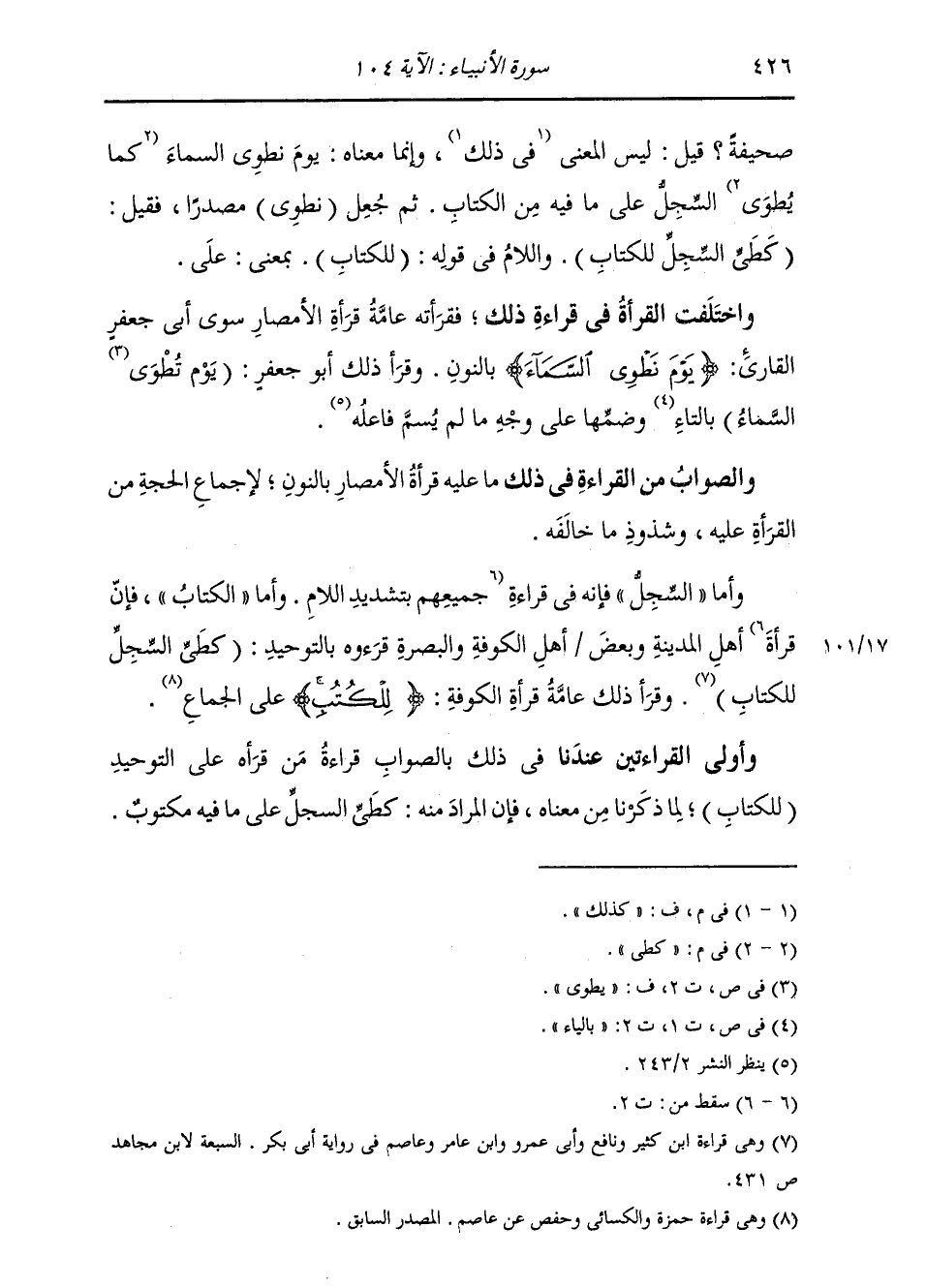 صَحِيفَةً؟ قِيلَ: لَيْسَ الْمَعْنَى كَذَلِكَ، وَإِنَّمَا مَعْنَاهُ: يَوْمَ نَطْوِي السَّمَاءَ كَطَيِّ السِّجِلِّ عَلَى مَا فِيهِ مِنَ الْكِتَابِ , ثُمَّ جَعَلَ نَطْوِي مَصْدَرًا، فَقِيلَ: (كَطَيِّ السِّجِلِّ لِلْكِتَابِ) وَاللَّامُ فِي قَوْلِهِ (لِلْكِتَابِ) بِمَعْنَى: عَلَى. وَاخْتَلَفَ الْقُرَّاءُ فِي قِرَاءَةِ ذَلِكَ، فَقَرَأَتْهُ عَامَّةُ قُرَّاءِ الْأَمْصَارِ، سِوَى أَبِي جَعْفَرٍ الْقَارِئِ: {يَوْمَ نَطْوِي السَّمَاءَ} [الأنبياء: 104] بِالنُّونِ. وَقَرَأَ ذَلِكَ أَبُو جَعْفَرٍ: (يَوْمَ تُطْوَى السَّمَاءُ) بِالتَّاءِ وَضَمِّهَا، عَلَى وَجْهِ مَا لَمْ يُسَمَّ فَاعِلُهُ وَالصَّوَابُ مِنَ الْقِرَاءَةِ فِي ذَلِكَ مَا عَلَيْهِ قُرَّاءُ الْأَمْصَارِ، بِالنُّونِ، لِإِجْمَاعِ الْحُجَّةِ مِنَ الْقُرَّاءِ عَلَيْهِ , وَشُذُوذِ مَا خَالَفَهُ. وَأَمَّا السِّجِلُّ , فَإِنَّهُ فِي قِرَاءَةِ جَمِيعِهِمْ بِتَشْدِيدِ اللَّامِ. وَأَمَّا الْكِتَابُ، فَإِنَّ قُرَّاءَ أَهْلِ الْمَدِينَةِ , وَبَعْضَ أَهْلِ الْكُوفَةِ وَالْبَصْرَةِ قَرَءُوُهُ بِالتَّوْحِيدِ: (كَطَيِّ السِّجِلِّ لِلْكِتَابِ) ، وَقَرَأَ ذَلِكَ عَامَّةُ قُرَّاءِ الْكُوفَةِ: { «لِلْكُتُبِ» } [الأنبياء: 104] عَلَى الْجِمَاعِ. وَأَوْلَى الْقِرَاءَتَيْنِ عِنْدَنَا فِي ذَلِكَ بِالصَّوَابِ: قِرَاءَةُ مَنْ قَرَأَهُ عَلَى التَّوْحِيدِ لِلْكِتَابِ لِمَا ذَكَرْنَا مِنْ مَعْنَاهُ، فَإِنَّ الْمُرَادَ مِنْهُ: كَطَيِّ السِّجِلِّ عَلَى مَا فِيهِ مَكْتُوبٌ.