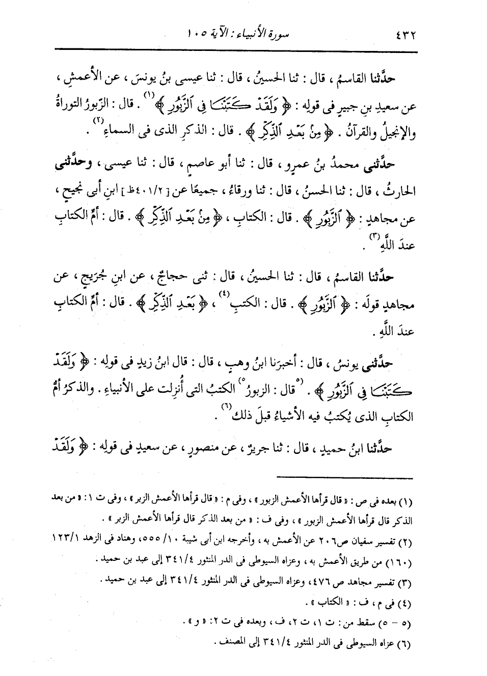 حَدَّثَنَا الْقَاسِمُ، قَالَ: ثنا الْحُسَيْنُ، قَالَ: ثنا عِيسَى بْنُ يُونُسَ، عَنِ الْأَعْمَشِ، عَنْ سَعِيدِ بْنِ جُبَيْرٍ، فِي قَوْلِهِ: {وَلَقَدْ كَتَبْنَا فِي الزَّبُورِ} [الأنبياء: 105] قَالَ: قَرَأَهَا الْأَعْمَشُ «الزُّبُرِ» قَالَ: " §الزَّبُورُ، وَالتَّوْرَاةُ، وَالْإِنْجِيلُ، وَالْقُرْآنُ {مِنْ بَعْدِ الذِّكْرِ} [الأنبياء: 105] قَالَ: الذِّكْرُ الَّذِي فِي السَّمَاءِ "