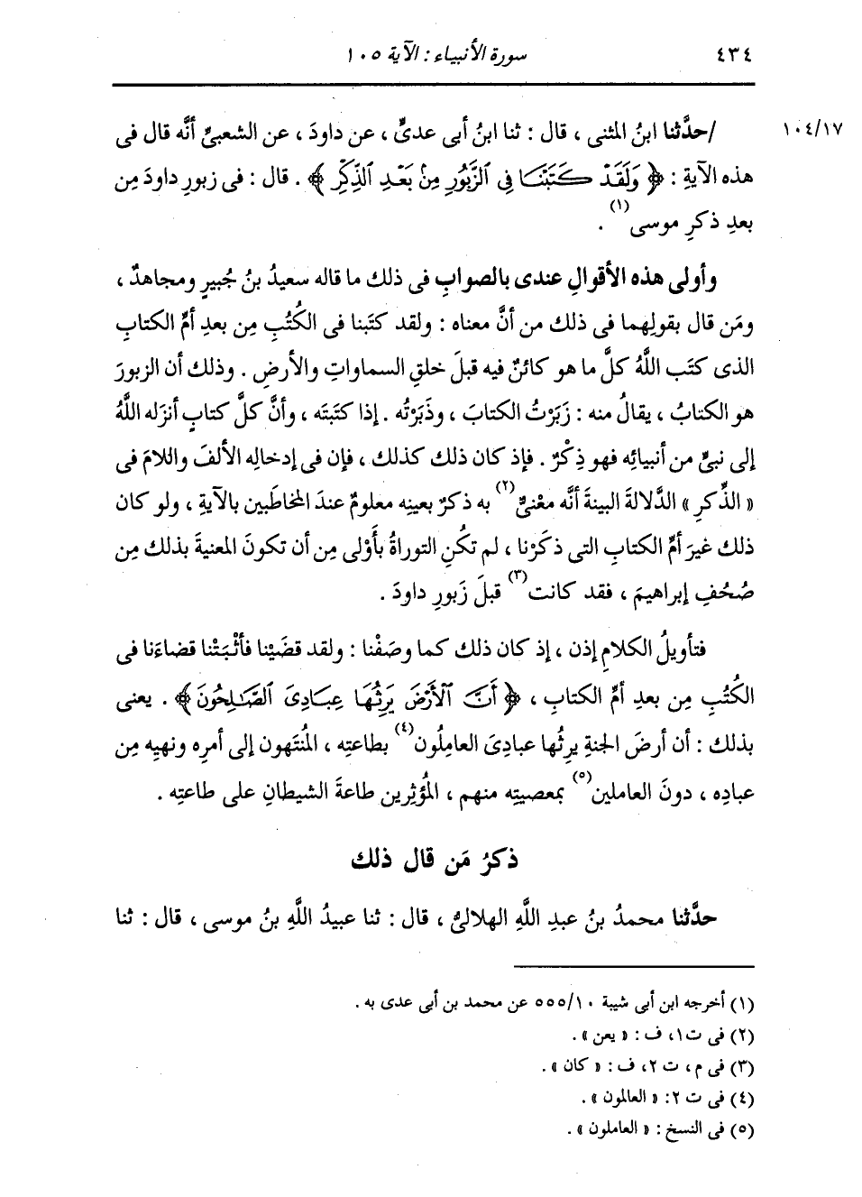 حَدَّثَنَا ابْنُ الْمُثَنَّى قَالَ: ثنا ابْنُ أَبِي عَدِيٍّ، عَنْ دَاوُدَ، عَنِ الشَّعْبِيِّ أَنَّهُ قَالَ فِي هَذِهِ الْآيَةِ: {وَلَقَدْ كَتَبْنَا فِي الزَّبُورِ مِنْ بَعْدِ الذِّكْرِ} [الأنبياء: 105] قَالَ: " §فِي زَبُورِ دَاوُدَ، مِنْ بَعْدِ ذِكْرِ مُوسَى وَأَوْلَى هَذِهِ الْأَقْوَالِ عِنْدِي بِالصَّوَابِ فِي ذَلِكَ مَا قَالَهُ سَعِيدُ بْنُ جُبَيْرٍ , وَمُجَاهِدٌ , وَمَنْ قَالَ بِقَوْلِهِمَا فِي ذَلِكَ، مِنْ أَنَّ مَعْنَاهُ: وَلَقَدْ كَتَبْنَا فِي الْكُتُبِ مِنْ بَعْدِ أُمِّ الْكِتَابِ الَّذِي كَتَبَ اللَّهُ كُلَّ مَا هُوَ كَائِنٌ فِيهِ قَبْلَ خَلْقِ السَّمَاوَاتِ وَالْأَرْضِ. وَذَلِكَ أَنَّ الزَّبُورَ هُوَ الْكِتَابُ، يُقَالُ مِنْهُ: زَبَرْتُ الْكِتَابَ وَذَبَرْتُهُ: إِذَا كَتَبْتُهُ، وَأَنَّ كُلَّ كِتَابٍ أَنْزَلَهُ اللَّهُ إِلَى نَبِيٍّ مِنْ أَنْبِيَائِهِ، فَهُوَ ذِكْرٌ. فَإِذْ كَانَ ذَلِكَ كَذَلِكَ، فَإِنَّ فِي إِدْخَالِهِ الْأَلْفَ وَاللَّامَ فِي الذِّكْرِ، الدَّلَالَةَ الْبَيِّنَةَ أَنَّهُ مَعْنِيُّ بِهِ ذِكْرٌ بِعَيْنِهِ مَعْلُومٍ عِنْدَ الْمُخَاطَبِينَ بِالْآيَةِ، وَلَوْ كَانَ ذَلِكَ غَيْرَ أُمِّ الْكِتَابِ الَّتِي ذَكَرْنَا لَمْ تَكُنِ التَّوْرَاةُ بِأَوْلَى مِنْ أَنْ تَكُونَ الْمَعْنِيَّةَ بِذَلِكَ مِنْ صُحُفِ إِبْرَاهِيمَ، فَقَدْ كَانَ قَبْلَ زَبُورِ دَاوُدَ فَتَأْوِيلُ الْكَلَامِ إِذَنْ، إِذْ كَانَ ذَلِكَ كَمَا وَصَفْنَا: وَلَقَدْ قَضَيْنَا، فَأَثْبَتْنَا قَضَاءَنَا فِي الْكُتُبِ مِنْ بَعْدِ أُمِّ الْكِتَابِ، أَنَّ الْأَرْضَ يَرِثُهَا عِبَادِيَ الصَّالِحُونَ , يَعْنِي بِذَلِكَ: أَنَّ أَرْضَ الْجَنَّةِ يَرِثُهَا عِبَادِيَ , الْعَامِلُونَ بِطَاعَتِهِ , الْمُنْتَهُونَ إِلَى أَمْرِهِ وَنَهْيِهِ مِنْ عِبَادِهِ، دُونَ الْعَامِلِينَ بِمَعْصِيَتِهِ مِنْهُمُ , الْمُؤْثِرِينَ طَاعَةَ الشَّيْطَانِ عَلَى طَاعَتِهِ
