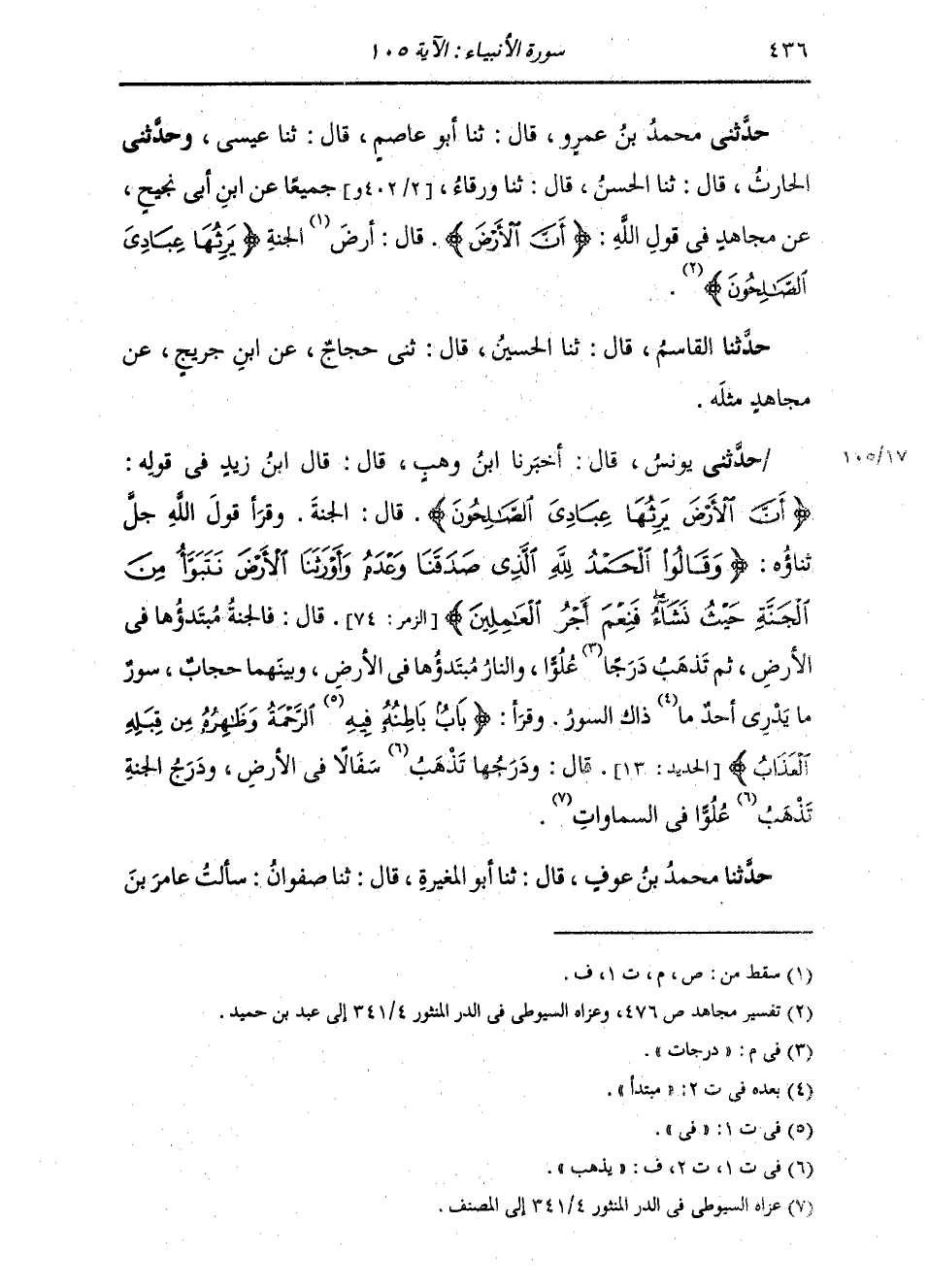 حَدَّثَنِي مُحَمَّدُ بْنُ عَمْرٍو، قَالَ: ثنا أَبُو عَاصِمٍ، قَالَ: ثنا عِيسَى، وَحَدَّثَنِي الْحَارِثُ، قَالَ: ثنا الْحَسَنُ، قَالَ: ثنا وَرْقَاءُ، جَمِيعًا، عَنِ ابْنِ أَبِي نَجِيحٍ، عَنْ مُجَاهِدٍ، فِي قَوْلِ اللَّهِ: {أَنَّ الْأَرْضَ} [الأنبياء: 105] قَالَ: " §الْجَنَّةُ، {يَرِثُهَا عِبَادِيَ الصَّالِحُونَ} [الأنبياء: 105] " حَدَّثَنَا الْقَاسِمُ قَالَ: ثنا الْحُسَيْنُ قَالَ: ثني حَجَّاجٌ، عَنِ ابْنِ جُرَيْجٍ، عَنْ مُجَاهِدٍ، مِثْلَهُ
