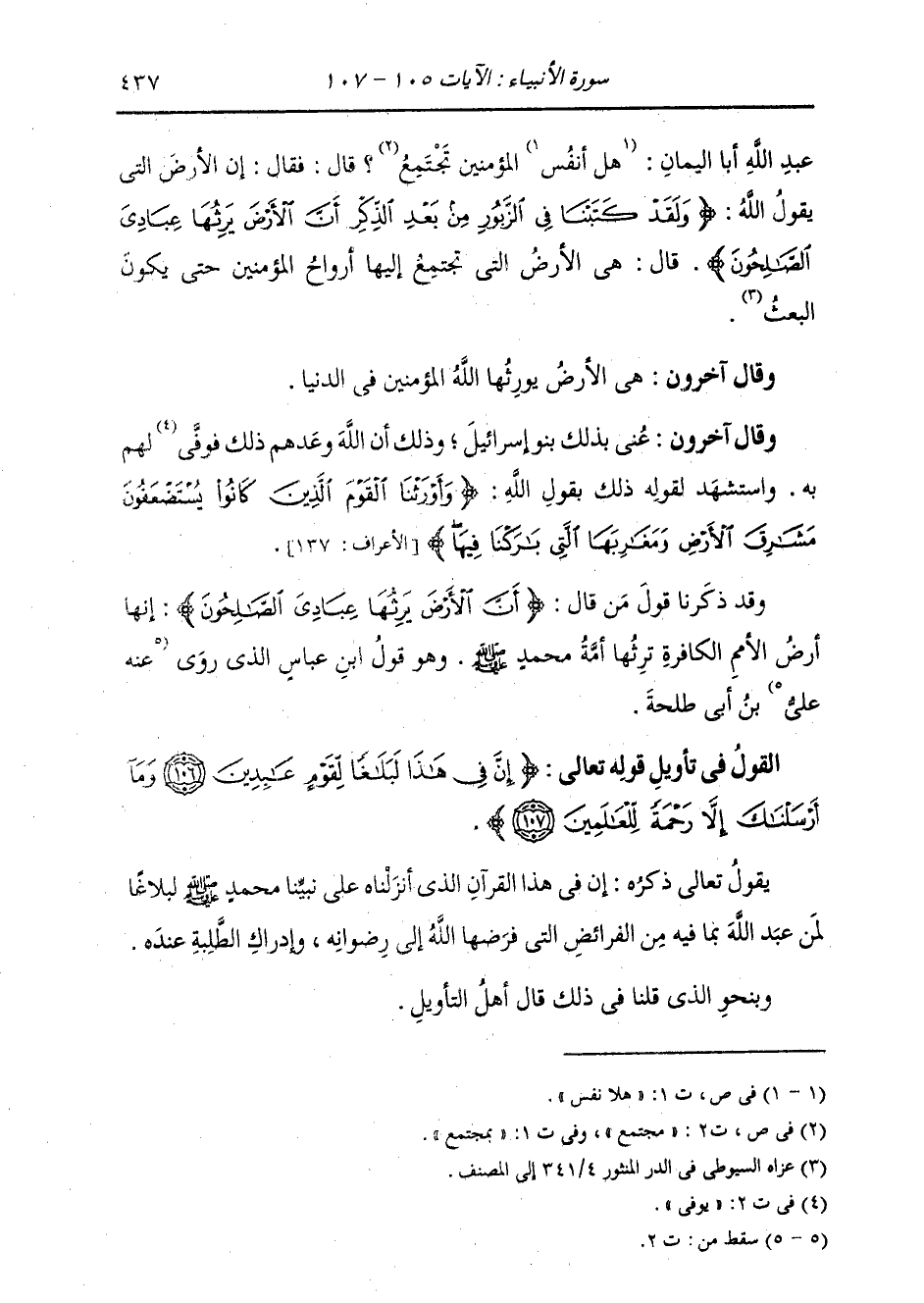 عَبْدِ اللَّهِ أَبَا الْيَمَانِ: هَلْ لِأَنْفُسِ الْمُؤْمِنِينَ مُجْتَمَعٌ؟ قَالَ: فَقَالَ: " §إِنَّ الْأَرْضَ الَّتِي يَقُولُ اللَّهُ: {وَلَقَدْ كَتَبْنَا فِي الزَّبُورِ مِنْ بَعْدِ الذِّكْرِ أَنَّ الْأَرْضَ يَرِثُهَا عِبَادِيَ الصَّالِحُونَ} [الأنبياء: 105] قَالَ: هِيَ الْأَرْضُ الَّتِي تَجْتَمِعُ إِلَيْهَا أَرْوَاحُ الْمُؤْمِنِينَ حَتَّى يَكُونَ الْبَعْثُ " وَقَالَ آخَرُونَ: هِيَ الْأَرْضُ يُوَرِّثُهَا اللَّهُ الْمُؤْمِنِينَ فِي الدُّنْيَا وَقَالَ آخَرُونَ: عُنِيَ بِذَلِكَ بَنُو إِسْرَائِيلَ , وَذَلِكَ أَنَّ اللَّهَ وَعَدَهُمْ ذَلِكَ , فَوَفَى لَهُمْ بِهِ. وَاسْتُشْهِدَ لِقَوْلِهِ ذَلِكَ بِقَوْلِ اللَّهِ: {وَأَوْرَثْنَا الْقَوْمَ الَّذِينَ كَانُوا يُسْتَضْعَفُونَ مَشَارِقَ الْأَرْضِ وَمَغَارِبَهَا الَّتِي بَارَكْنَا فِيهَا} [الأعراف: 137] . وَقَدْ ذَكَرْنَا قَوْلَ مَنْ قَالَ: {أَنَّ الْأَرْضَ يَرِثُهَا عِبَادِيَ الصَّالِحُونَ} [الأنبياء: 105] أَنَّهَا أَرْضُ الْأُمَمِ الْكَافِرَةِ، تَرِثُهَا أُمَّةُ مُحَمَّدٍ صَلَّى اللهُ عَلَيْهِ وَسَلَّمَ. وَهُوَ قَوْلُ ابْنِ عَبَّاسٍ الَّذِي رَوَى عَنْهُ عَلِيُّ بْنُ أَبِي طَلْحَةَ